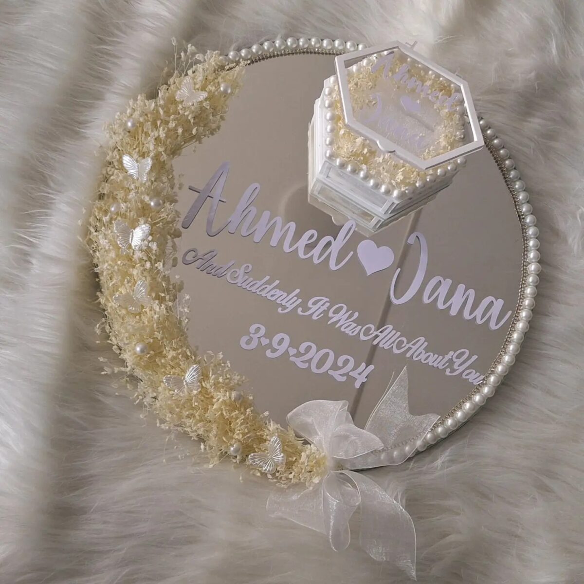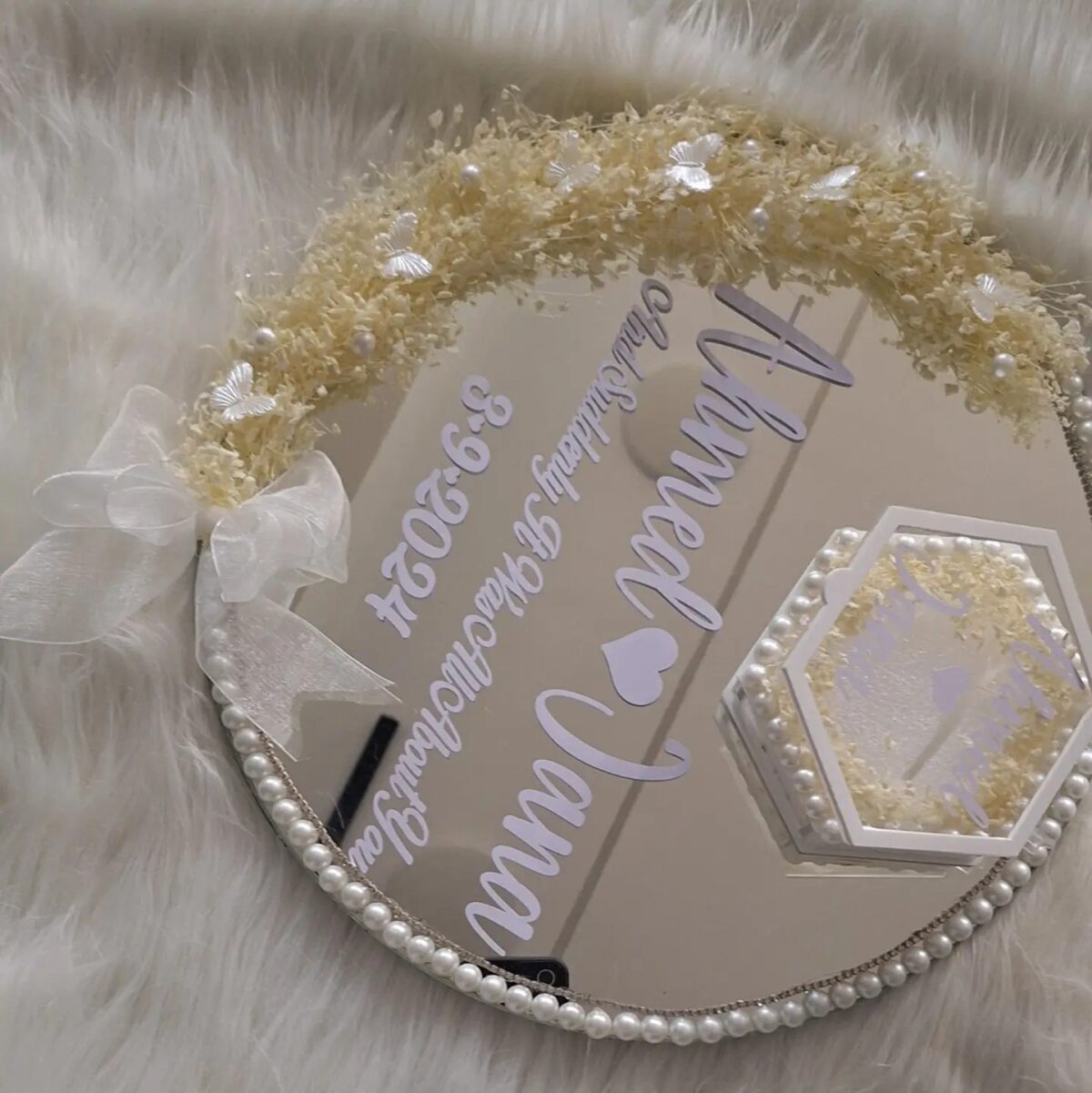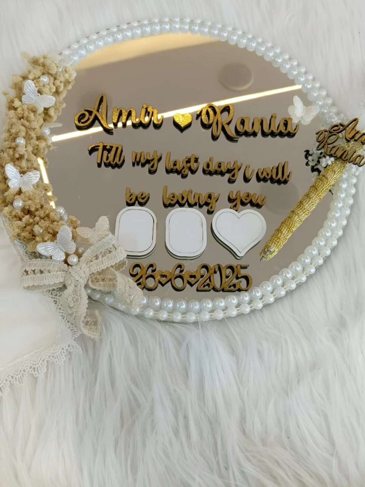• مرايات محفورة بالليزر عليها اسمك وتاريخك بخط أنيق.