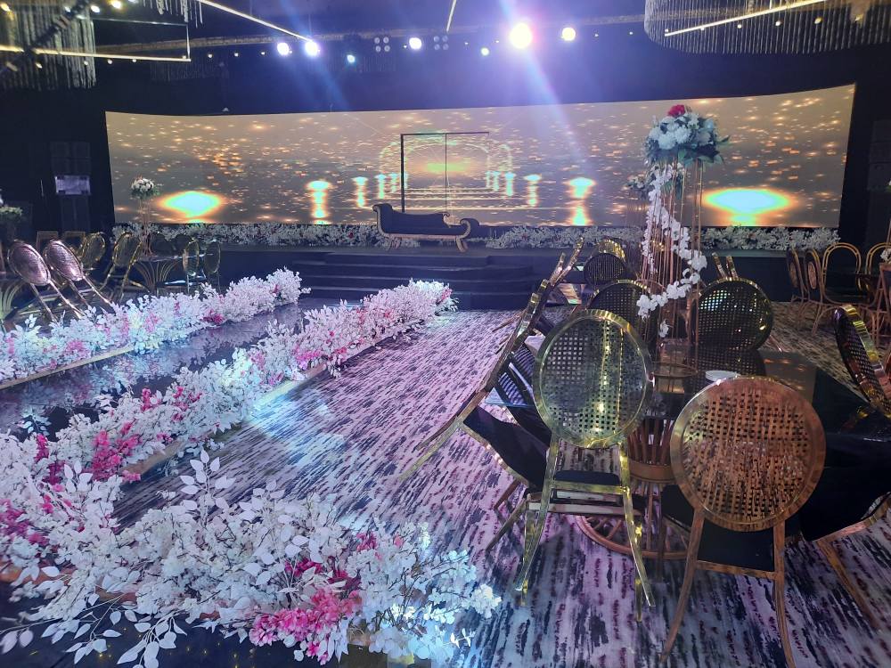القاعة بتستوعب عدد متوسط من الضيوف وبتتميز بتقسيم عملي للطاولات والكراسي. المساحة مش كبيرة قوي، لكنها منظمة كويس وبتناسب اللي عايز حفل بسيط ومرتب. الكوشة بتكون في مكان واضح، والممر مريح لمرور العرسان أو العائلة.