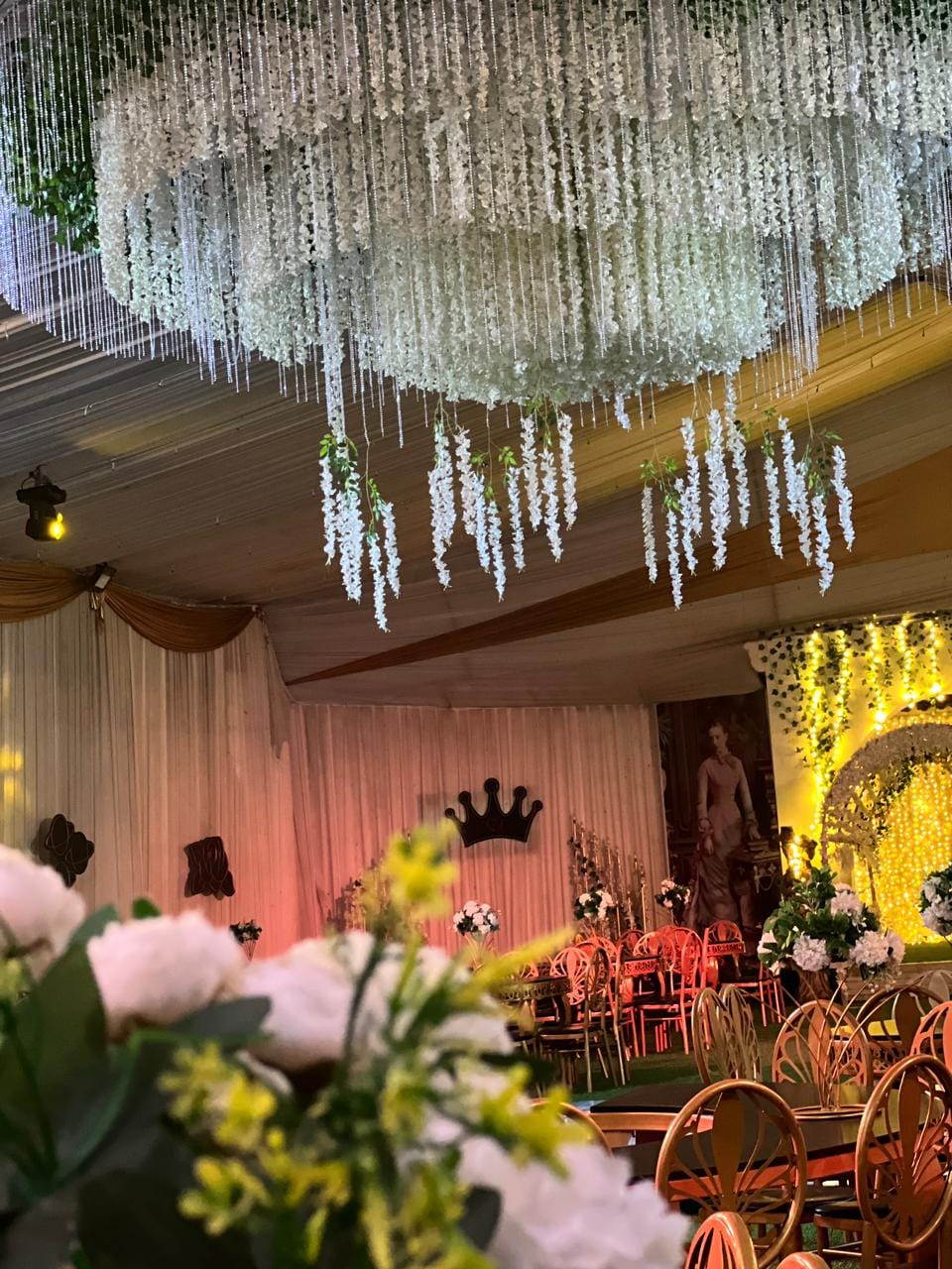 الخلفية الخاصة بالكوشة سهلة التعديل وتقدر تضيف ورود طبيعية أو إضاءات بسيطة حسب ذوقك وثيم الحفلة