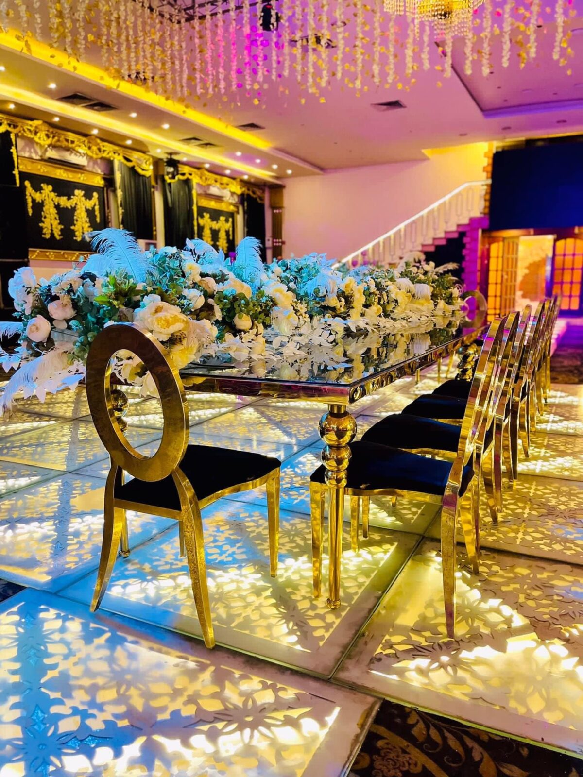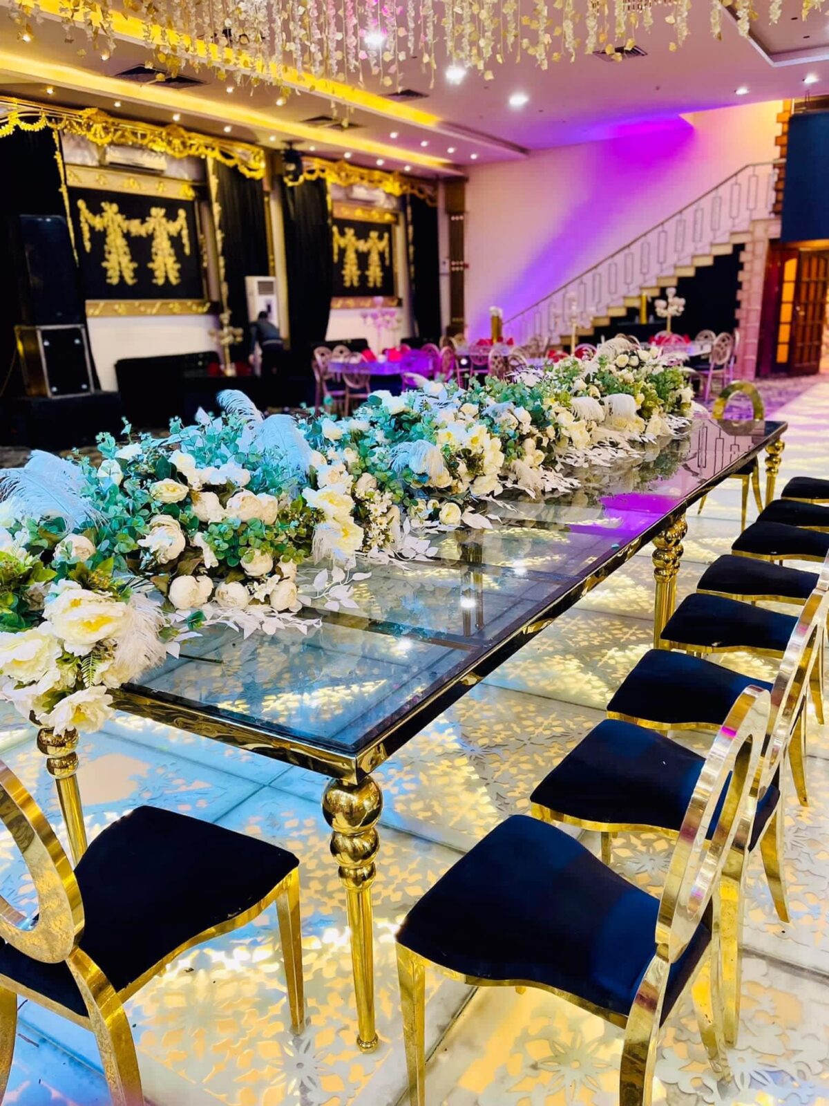 تقدر تضيف ورود طبيعية أو ستاندات إضاءة ناعمة حسب ذوقك الشخصي وثيم الحفلة