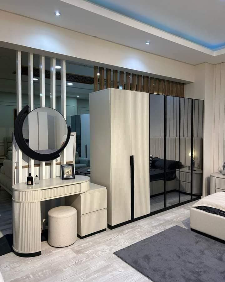 في قسم غرف النوم، هتلاقي سراير مودرن وكلاسيك، ودولايب بتقسيمات متنوعة، وتسريحات بتكمل الشكل العام للغرفة. كمان التصميمات مناسبة للمساحات الكبيرة والصغيرة، يعني هتلاقي اللي يناسب شقتك مهما كانت مساحتها.