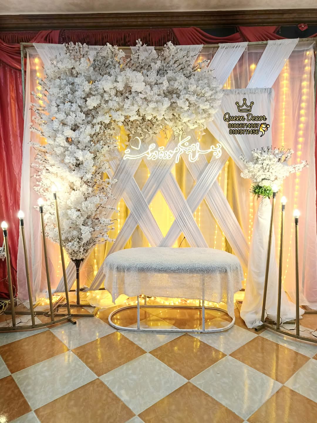 الناس اللي حضرت أفراح من تنفيذ Queen Decor دايمًا بتفتكر شكل القاعة، وتنسيق الورود، والإضاءة، والجو العام، وده بيدّي للعريس والعروسة إحساس إن تعب التحضيرات ما راحش على الفاضي.