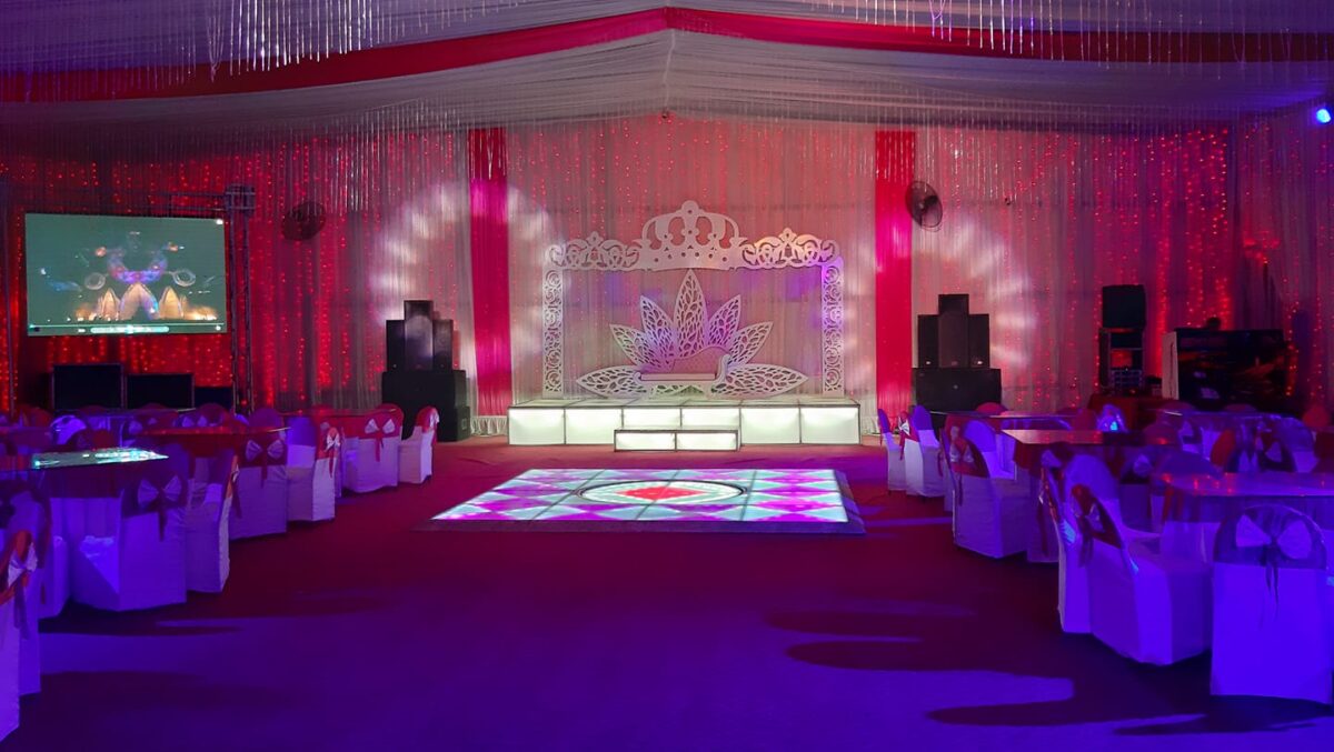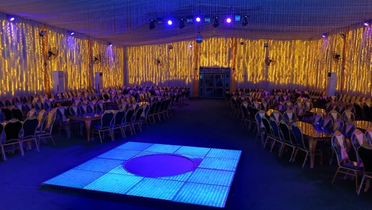 المكان بيضم منطقة للكوشة، بتكون بسيطة وممكن تضيف عليها لمستك الخاصة، بالإضافة لمنطقة مخصصة للبوفيه، ومكان للدي جي أو فقرات الحفل لو حابب تضيف.
