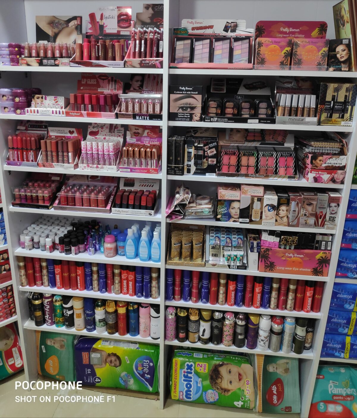 المحل منظم بأقسام واضحة: قسم للوجه، قسم للعيون، قسم للشفايف، وقسم للأدوات؛ علشان تلاقي كل حاجة بسهولة ومن غير تعب.