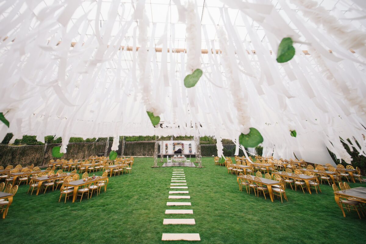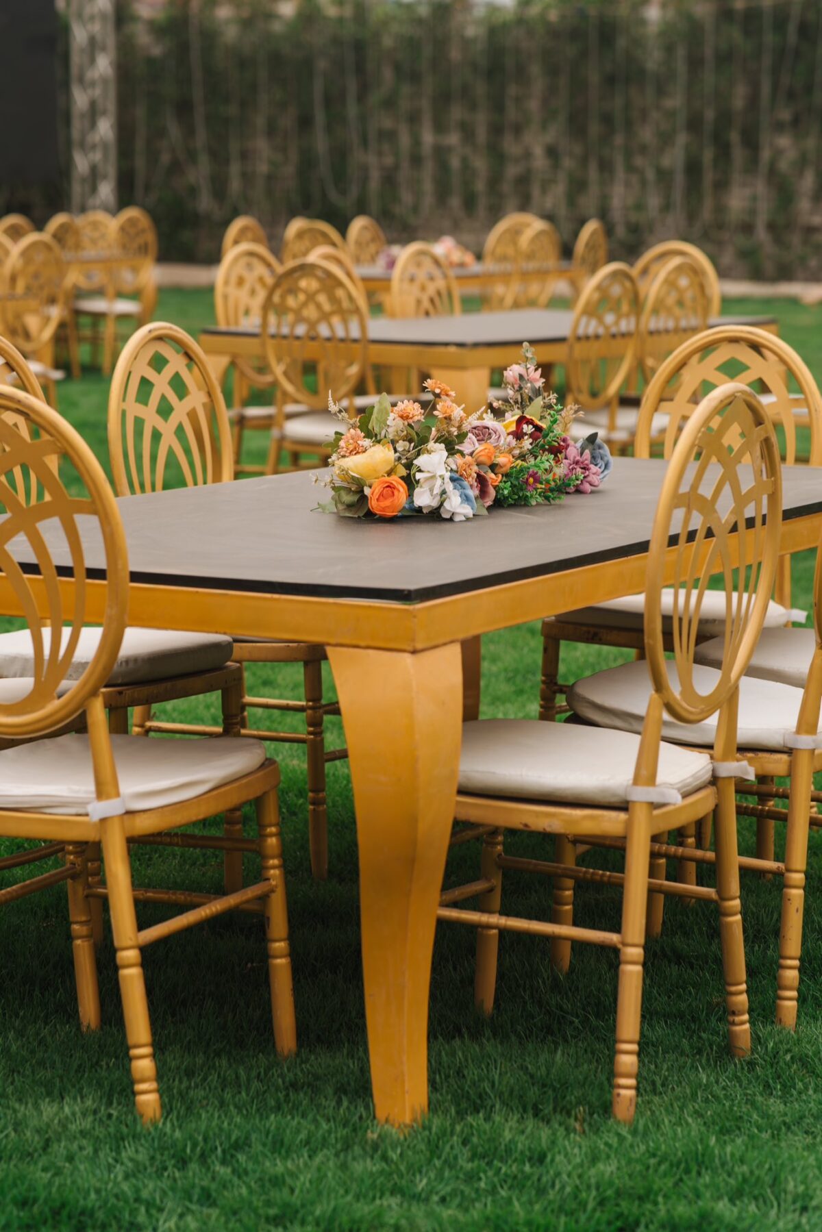 ترابيزات وكراسي مغطاة بأغطية متناسقة مع ديكور القاعة