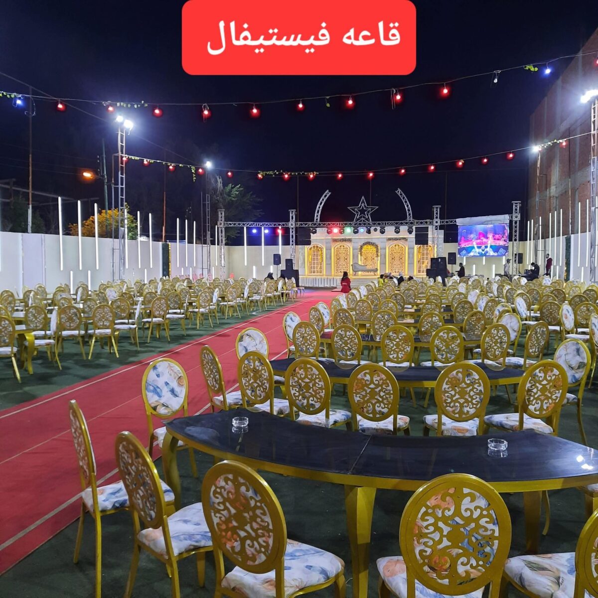 قاعة فستيفال مساحتها متوسطة لحد كبيرة بتستوعب من 150 لحد 400 ضيف حسب ترتيب الترابيزات والكراسي المساحة متقسمة بشكل عملي فيه ممر واضح لدخول العروسين أو لضيوف الشرف ومنطقة مخصصة للكوشة في مقدمة القاعة وكمان مساحة كبيرة للضيوف يقدروا يتحركوا براحتهم من غير تزاحم