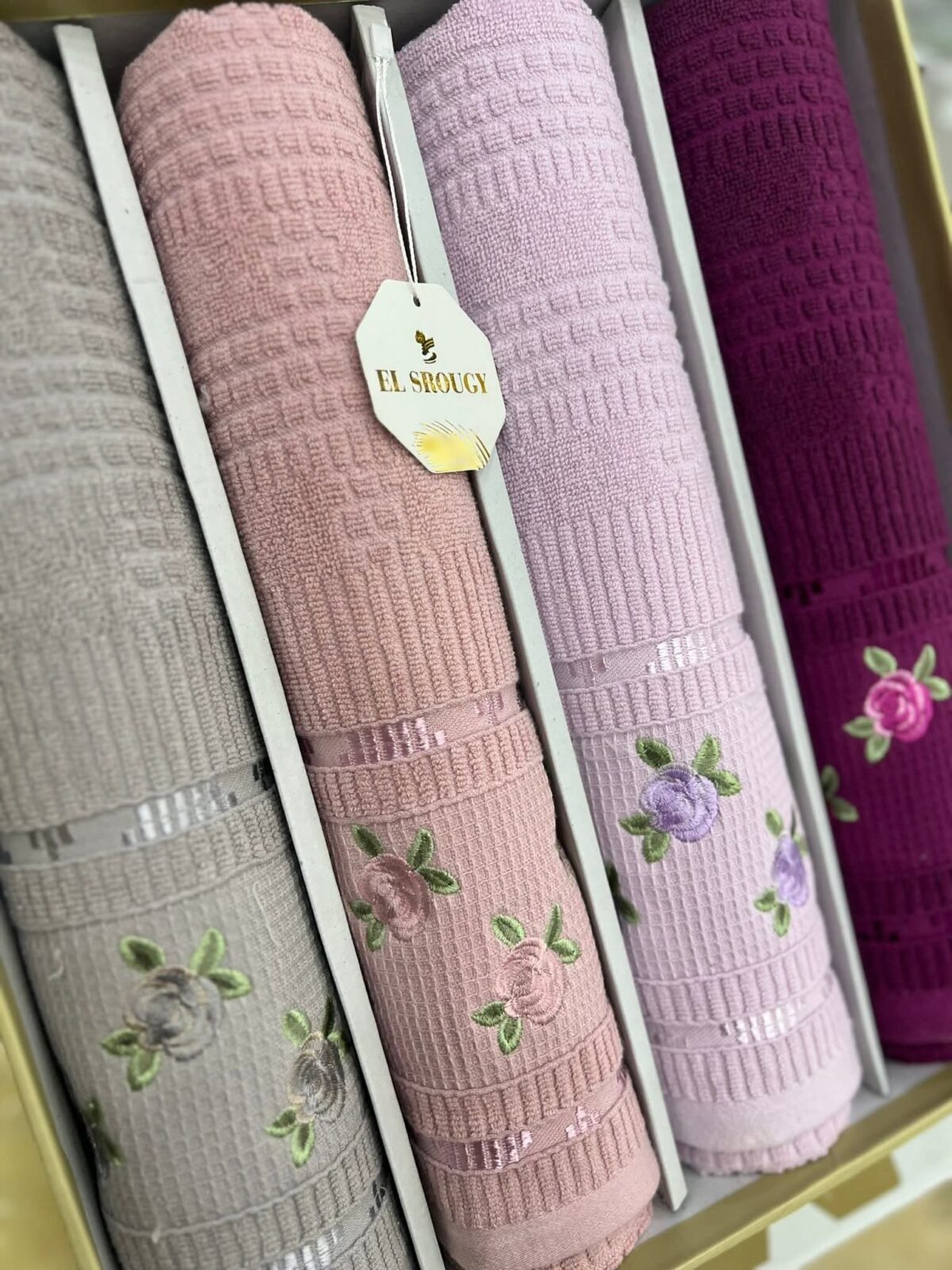 المعرض بيقدّم أطقم حمّام من القطن الطبيعي، بامتصاص عالي وملمس ناعم. الألوان ثابتة حتى بعد الغسيل، والخياطة متينة علشان تعيش فترة طويلة من غير ما تفقد شكلها أو ملمسها.
