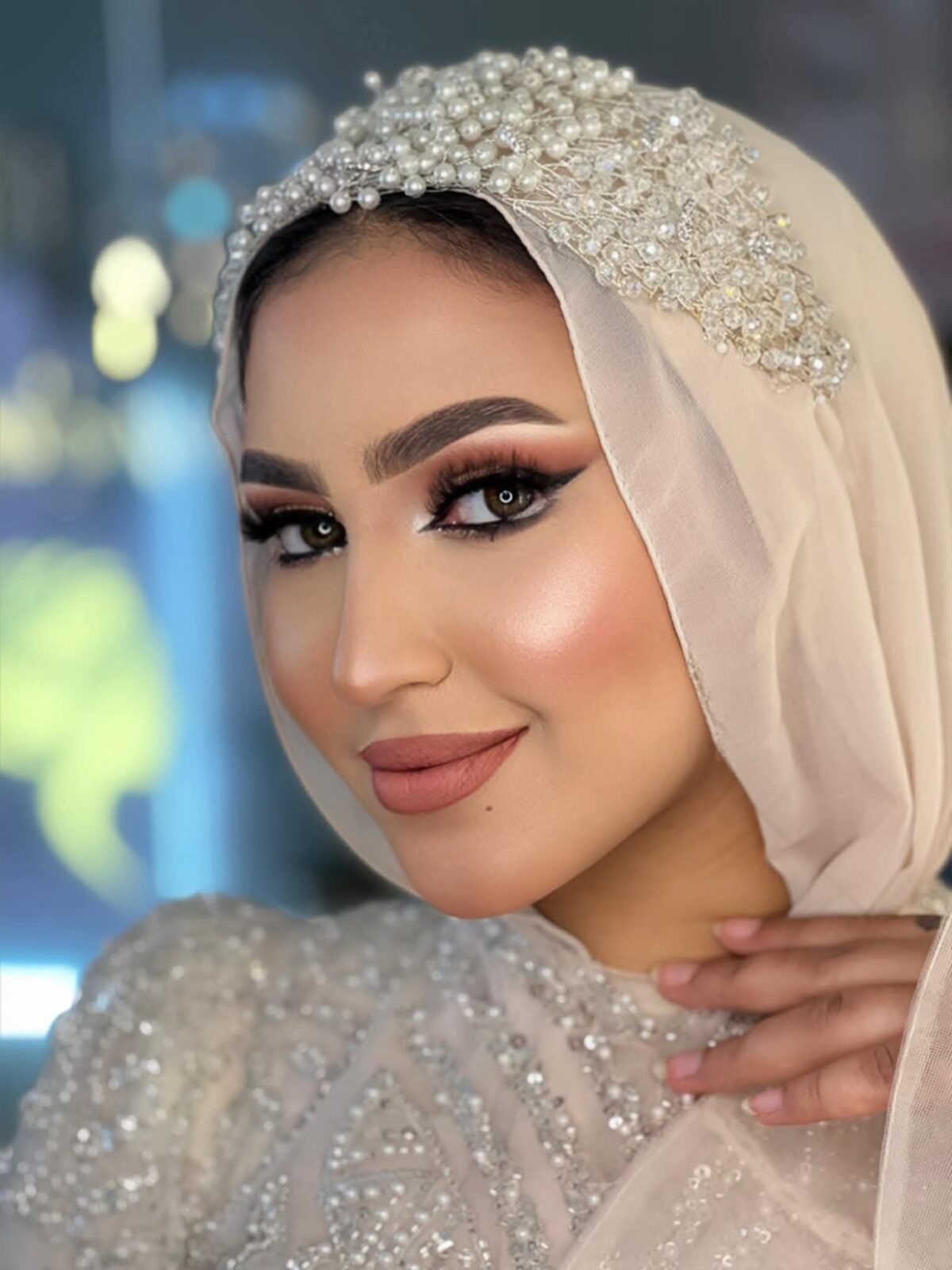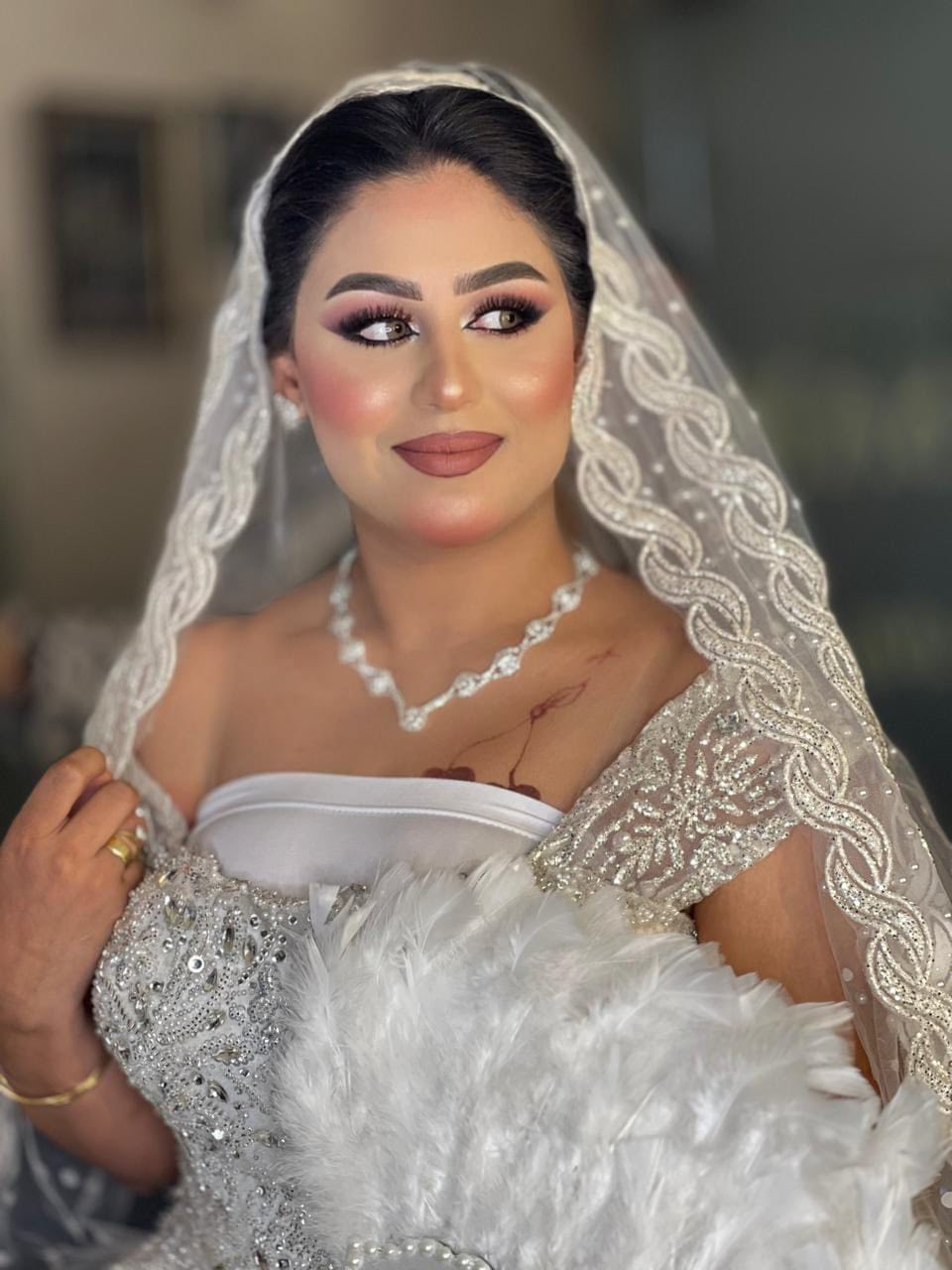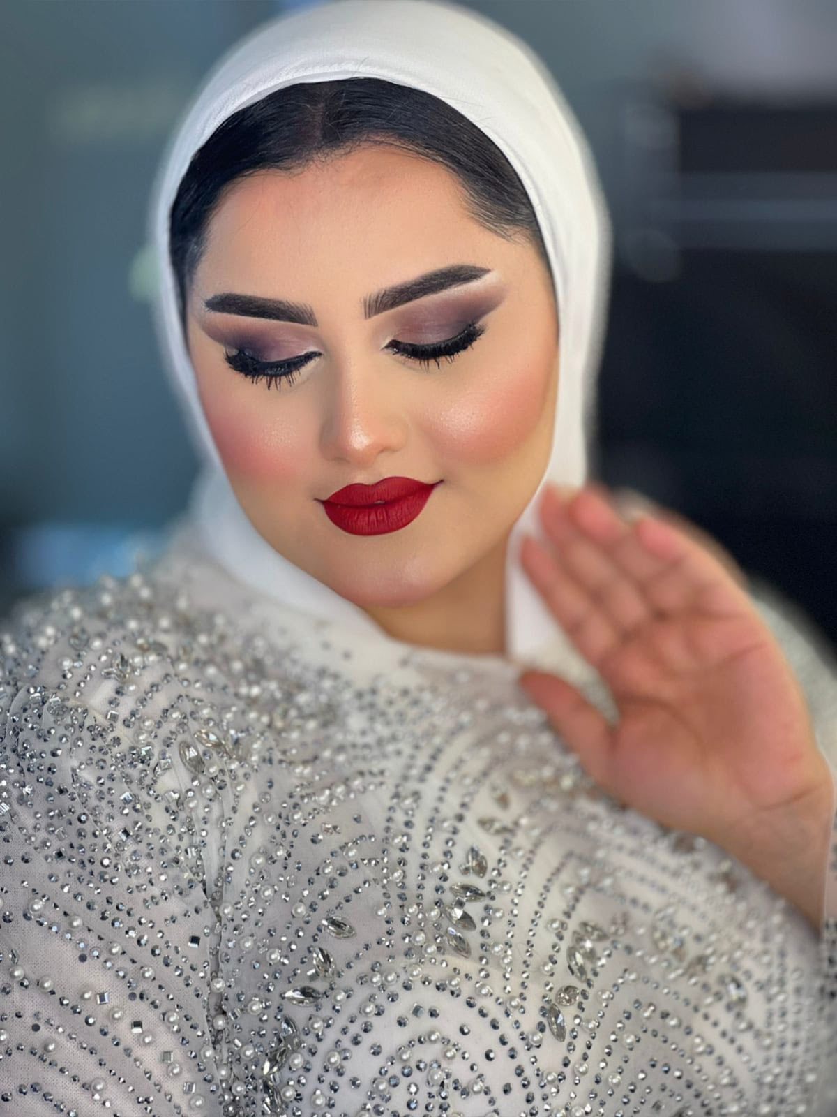 ولو العروسة حابة لوك أقوى، كارما بتعرف توازن بين الجرأة والرقة. ممكن تعمل سموكي بدرجات رمادية أو نحاسية، وتختار روج جريء زي الأحمر أو الفوشيا، لكن دايمًا بتحافظ إن الشكل النهائي يفضل متناسق وراقي. عندها حس فني عالي جدًا في توزيع الكونتور والهايلايتر بطريقة تبرز الملامح وتدي إشراقة ناعمة من غير مبالغة أو خطوط ظاهرة.