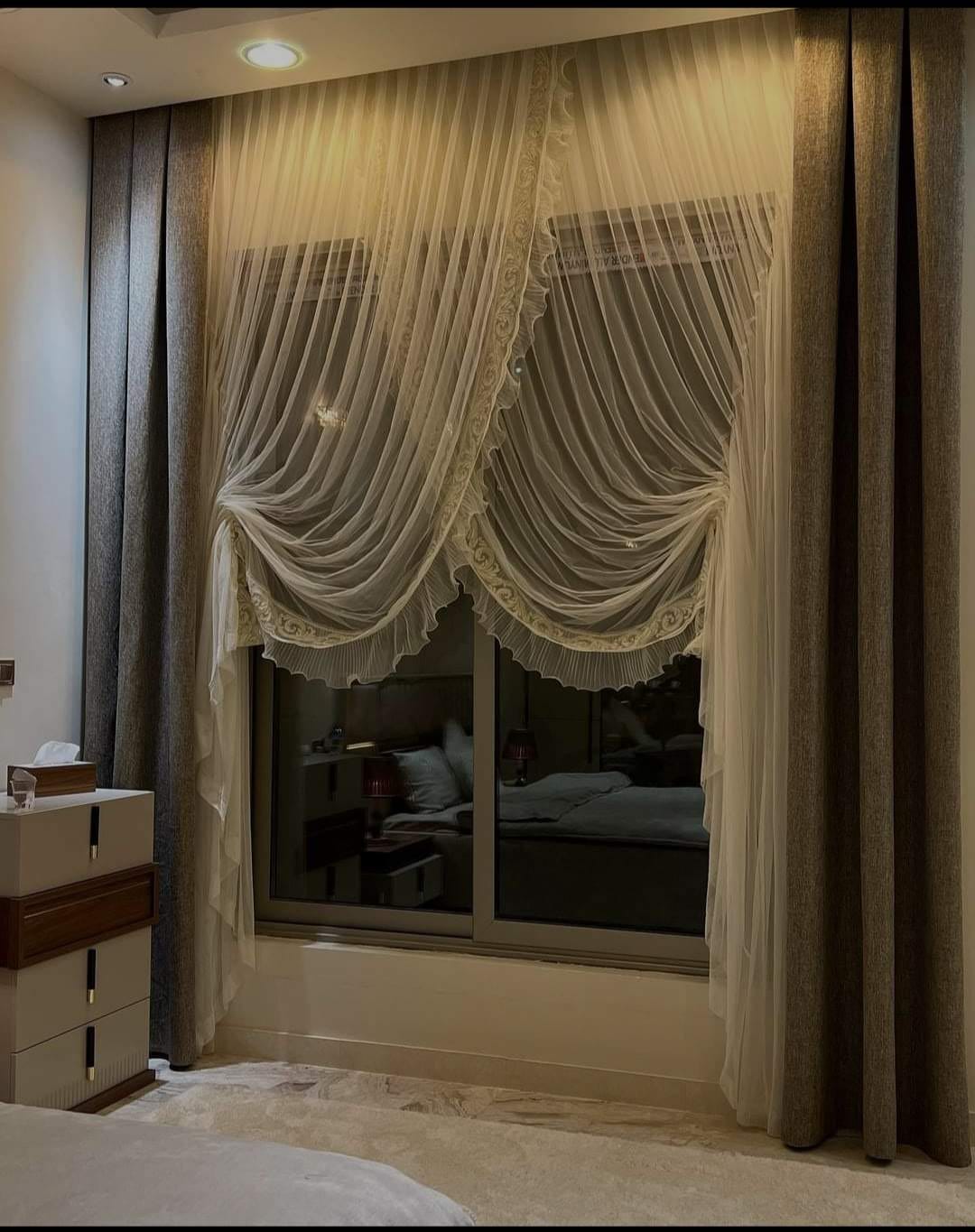 ستائر الفنان بيوفر تفصيل حسب المقاسات اللي عندك، سواء كانت فتحة كبيرة أو صغيرة، شباك عادي أو باب بلكونة. كل شغل بينفذ بدقة على حسب: