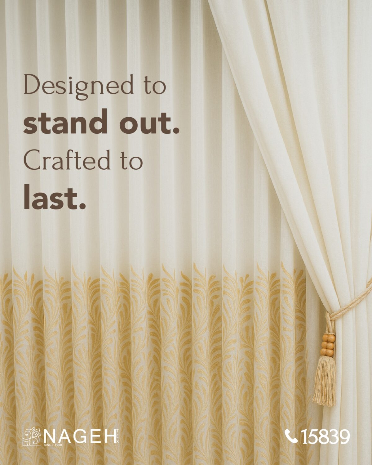 لو محتاج شغل تفصيل، Nageh Tex بيوفر خدمة التنفيذ حسب المقاس. بتختار نوع القماش، المقاس، طريقة التعليق (حلقات – شريط – سكة)، وهم بينفّذوا كل حاجة بالتنسيق اللي يليق على المكان. كل التفاصيل بتكون باختيارك.