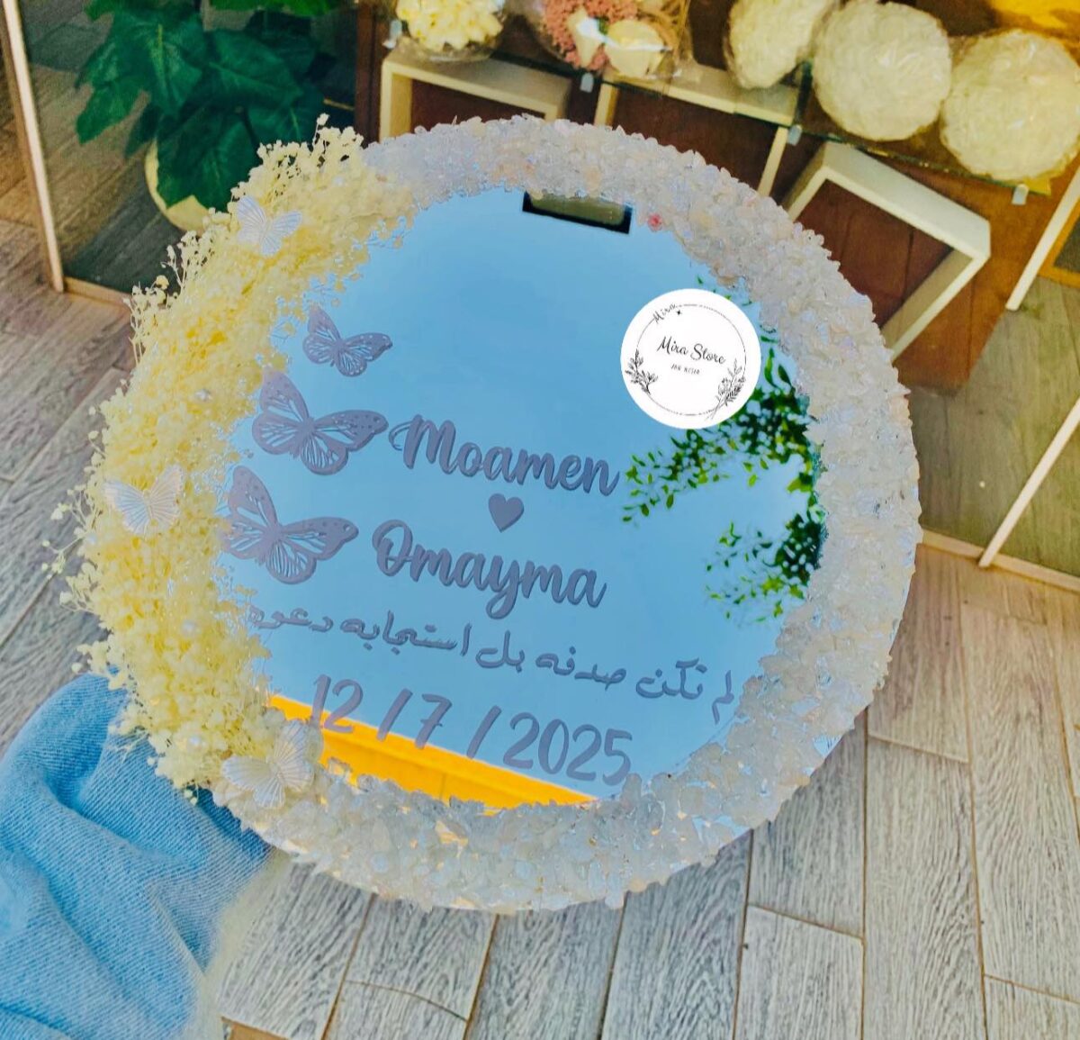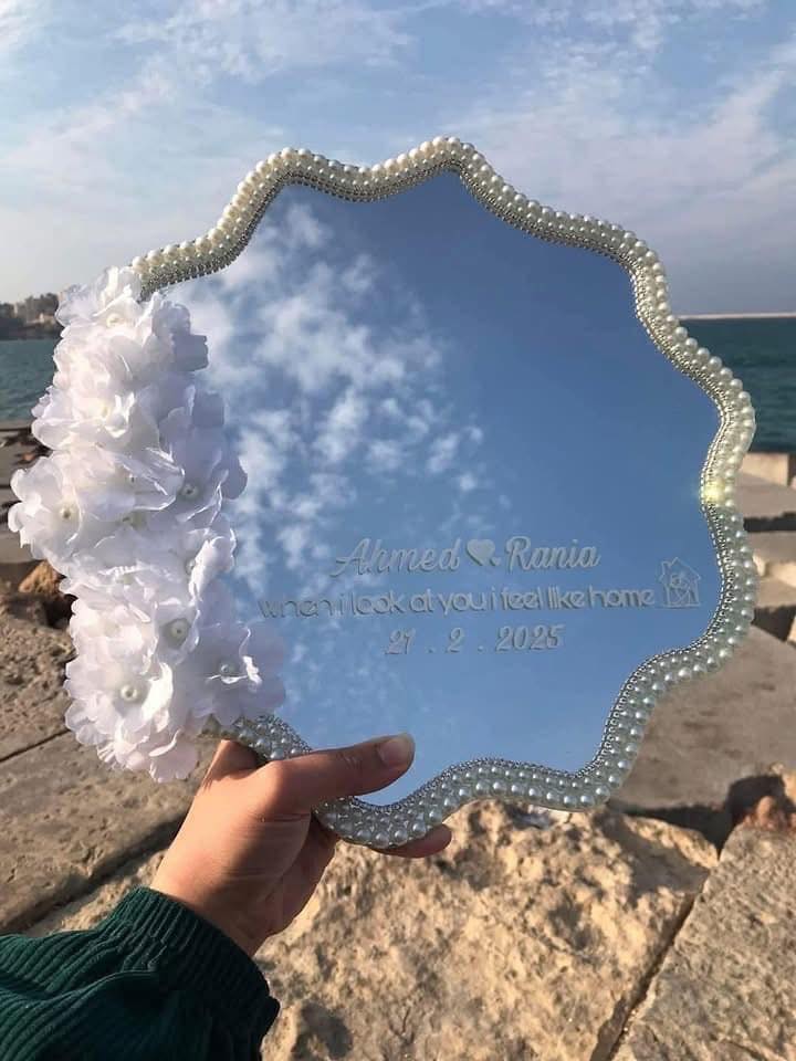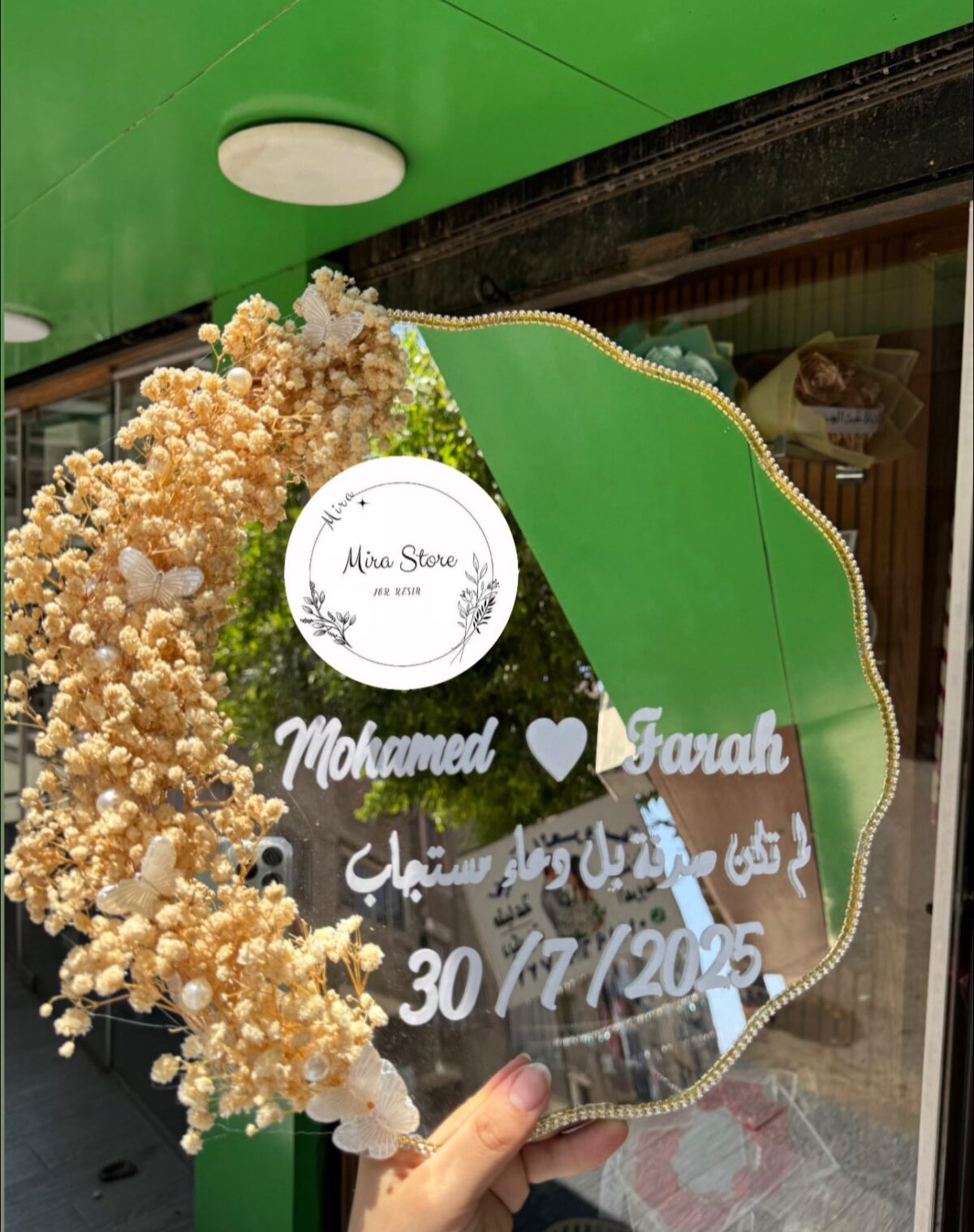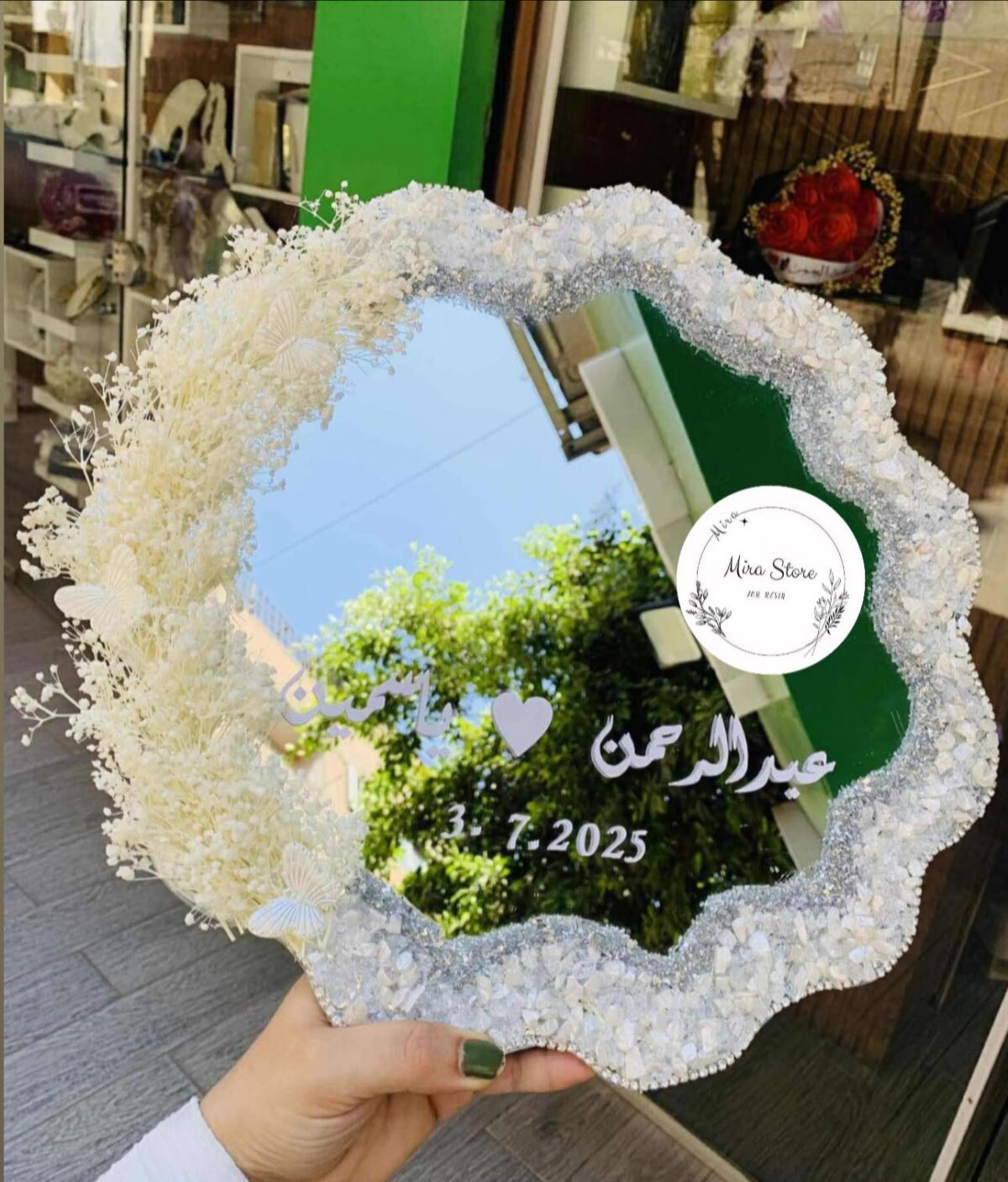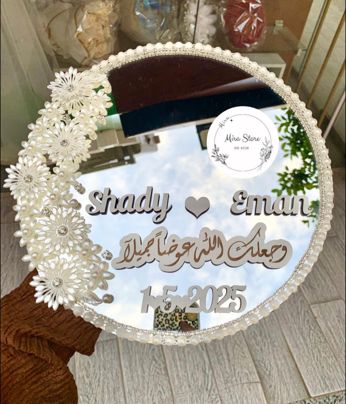 - مرايات محفورة بالأسماء والتاريخ بخط راقي وتزيين بسيط من الورد الصناعي.