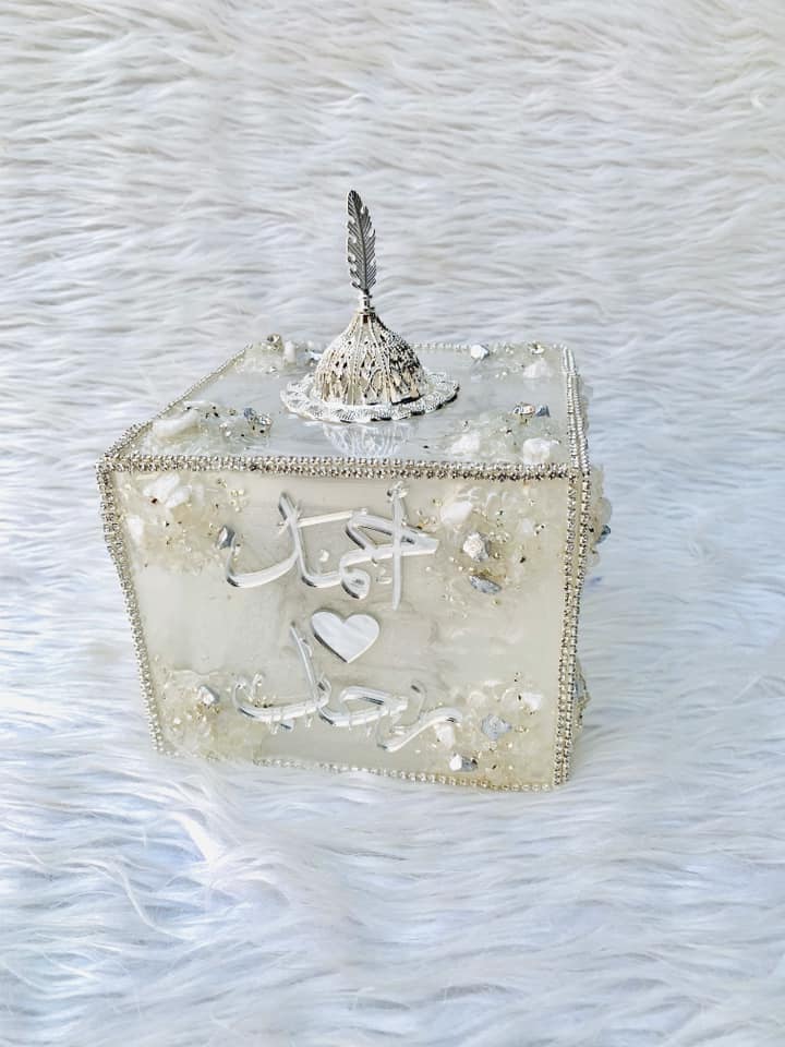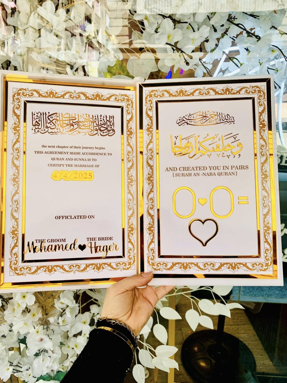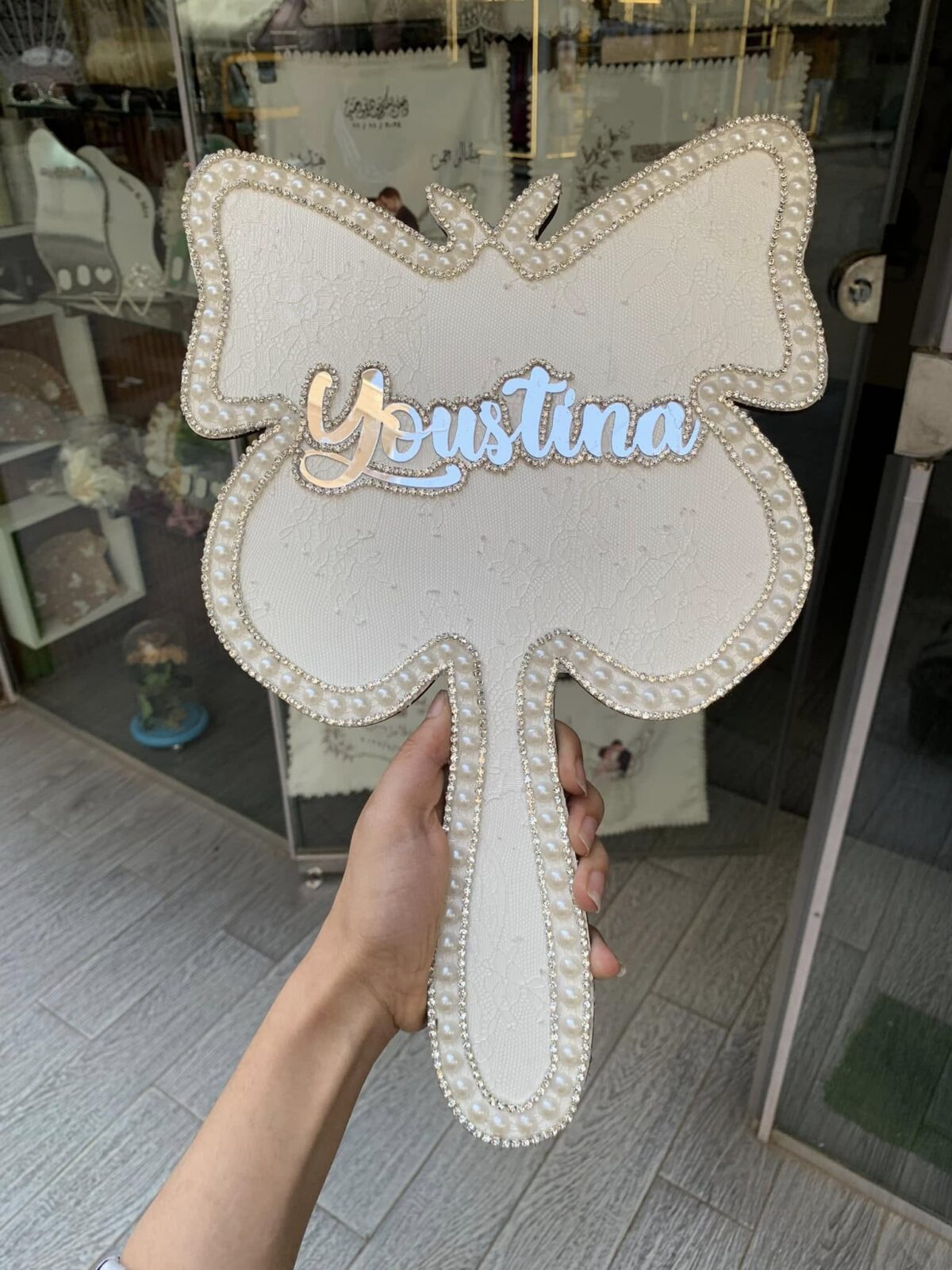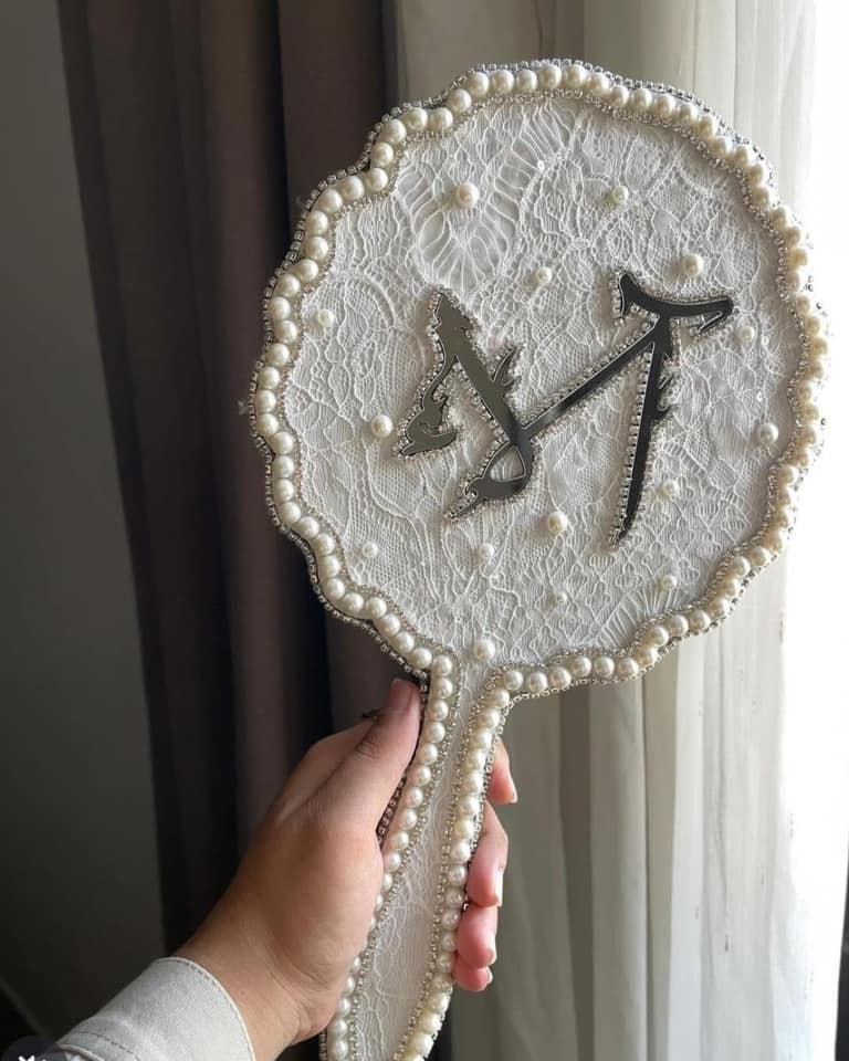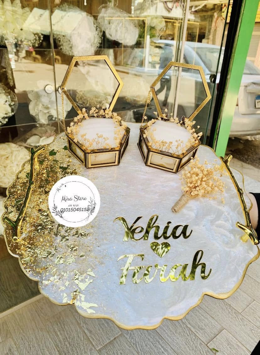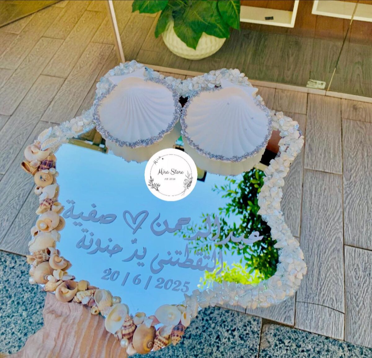 - مرايات محفورة بالأسماء والتاريخ بخط راقي وتزيين بسيط من الورد الصناعي.