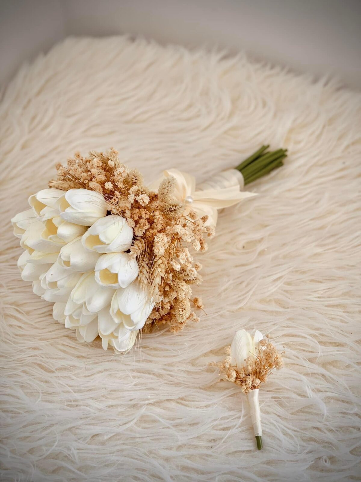 - بوكيهات ورد طبيعي أو صناعي بألوان متناسقة مع فستانك وثيم الفرح.