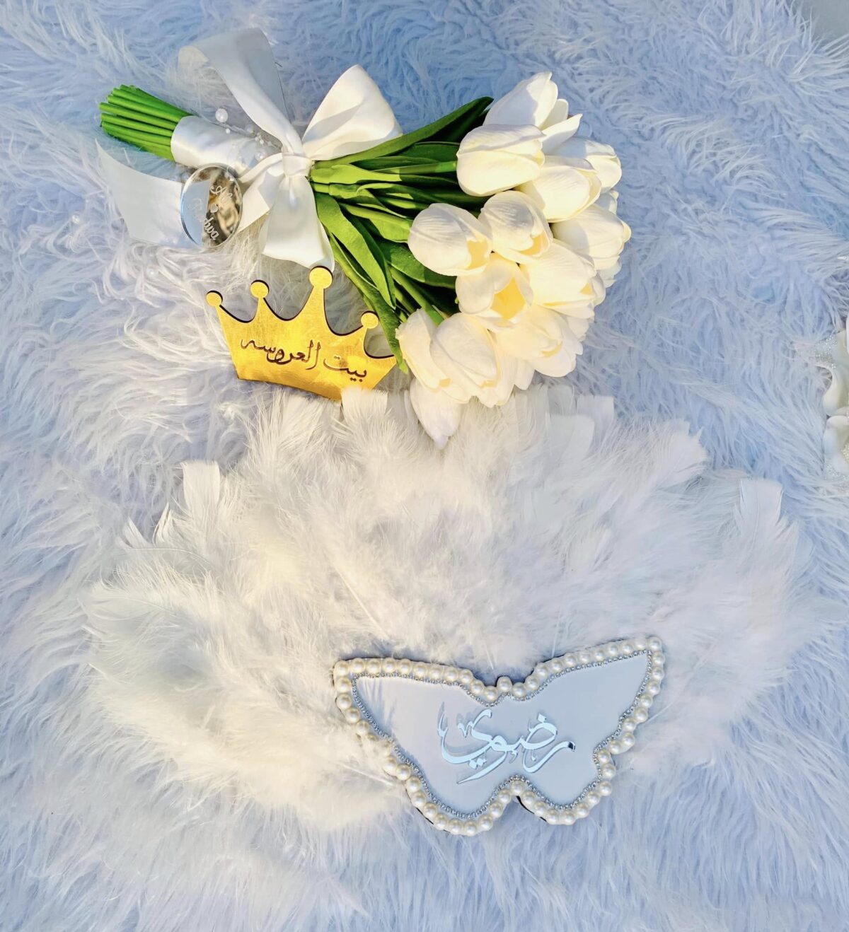 - دبابيس عروسة مكتوب عليها اسمك أو كلمة "عروسة" بتصميم أنيق.