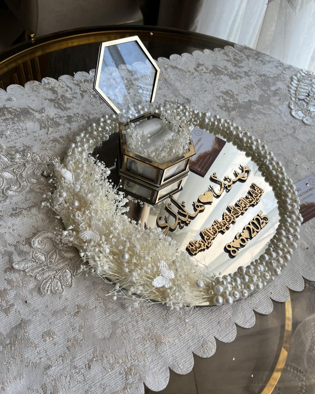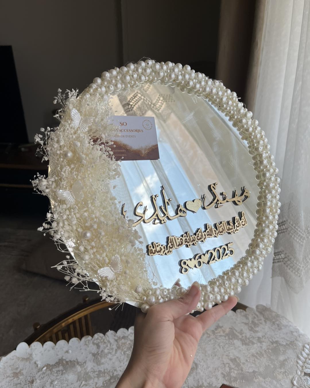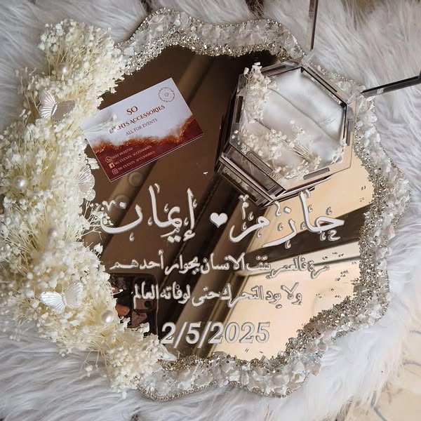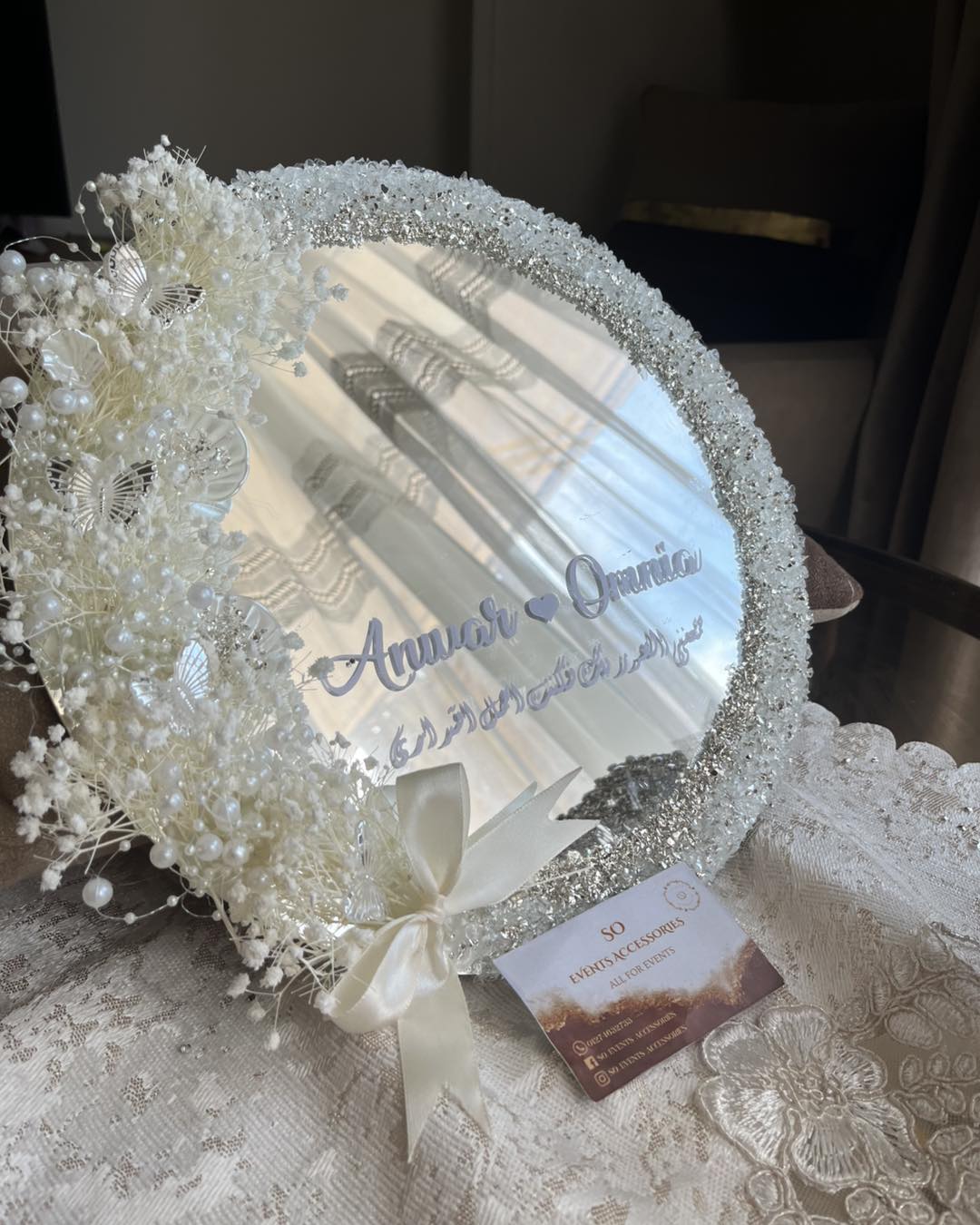 • مرايات محفورة بالليزر باسمك وتاريخك، متزينة بورد أو شرائط شيك.