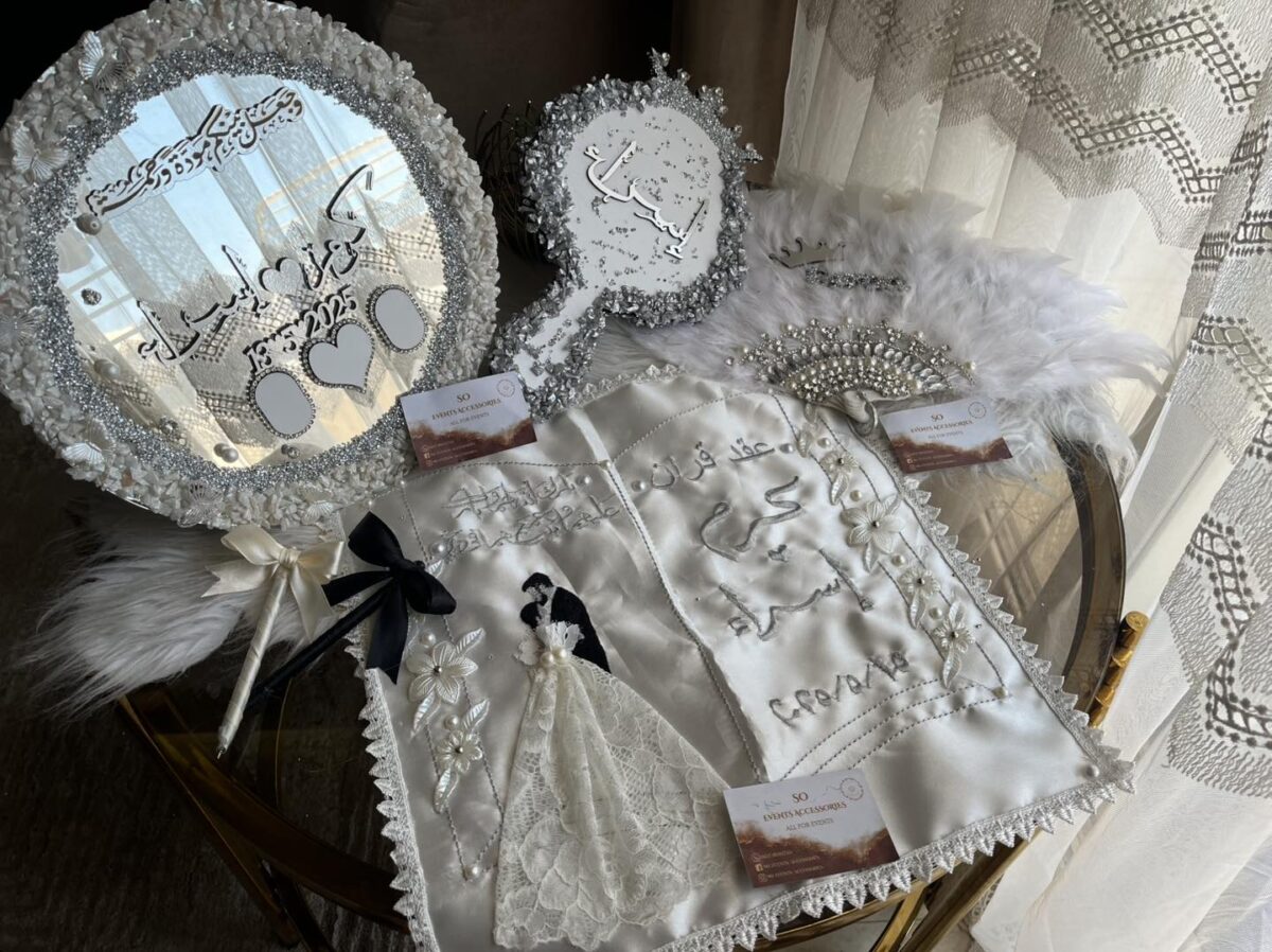 • دبابيس العروسة مكتوب عليها اسمك أو كلمة “عروسة”.