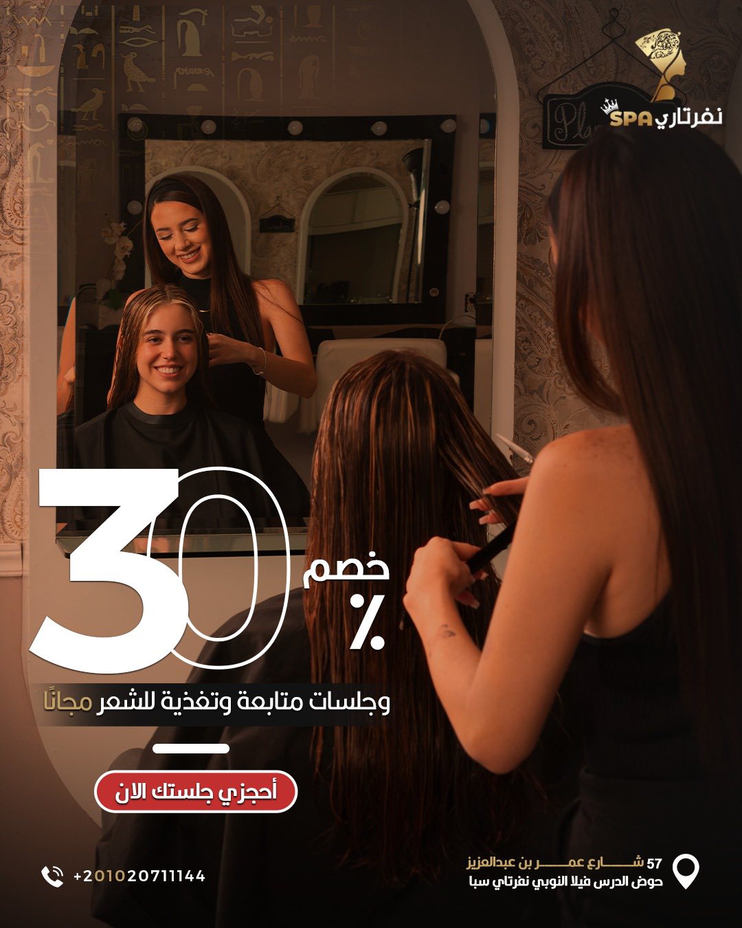 ومن الخدمات اللي بتخلي حمام نفرتاري مميز كمان جلسات العناية بالشعر، سواء ترميم، تغذية، أو جلسات بالبروتين والكيراتين. دي مهمة جدًا لأي عروسة عايزة شعرها يبان صحي ولامع في يومها الكبير. كمان فيه جلسات عناية بالأظافر والباديكير والمانيكير بشكل احترافي جدًا.