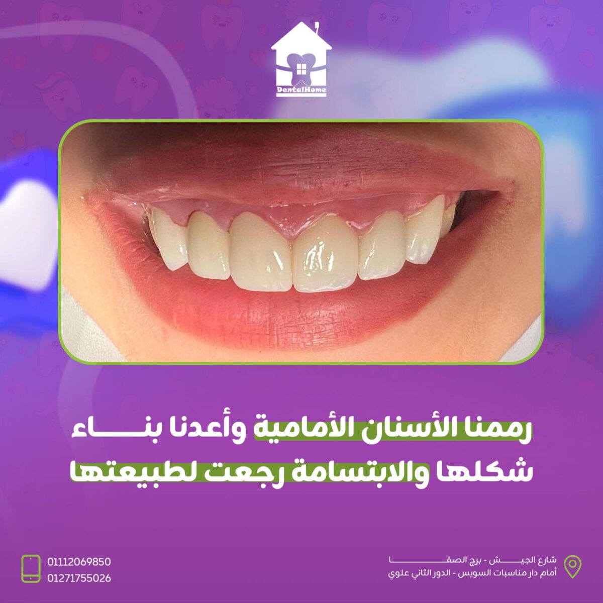 مواعيد Dental Home مرنة من الصبح لحد المغرب وحتى السبت للحالات الطارئة. الحجز سهل جداً عن طريق الواتساب أو الاتصال أو من خلال موقعهم الإلكتروني. ولو اضطررت تأجل موعدك، ممكن تعدّله قبل ٢٤ ساعة من غير أي رسوم إضافية. الأسعار شفافة وواضحة من البداية عشان تكون عارف التكلفة بالكامل قبل أول إجراء.