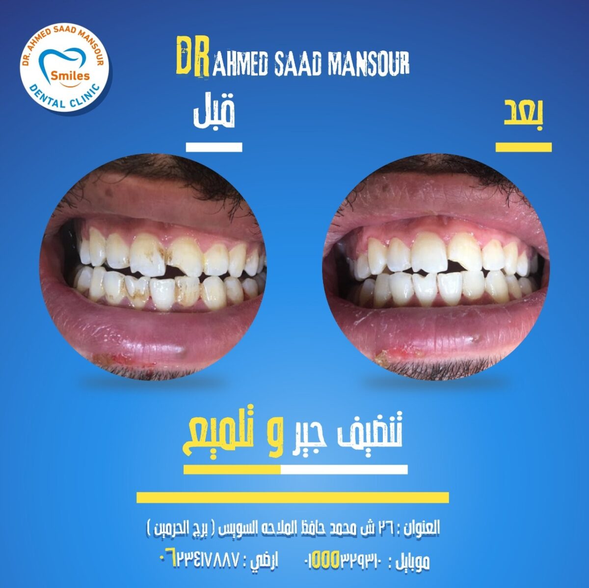 في النهاية، Smiles Dental Clinic مع دكتور أحمد سعد منصور بتمزج بين أحدث تقنيات طب الأسنان والرعاية الإنسانية والراحة النفسية، فتضمنلك تجربة علاجية متكاملة وابتسامة صحية جميلة تدوم معاك مدى الحياة.