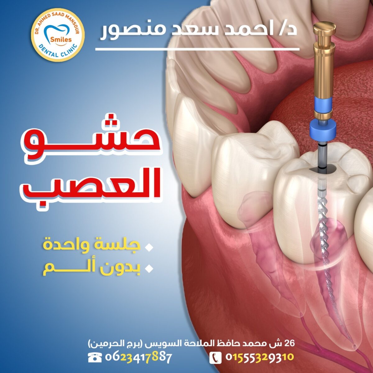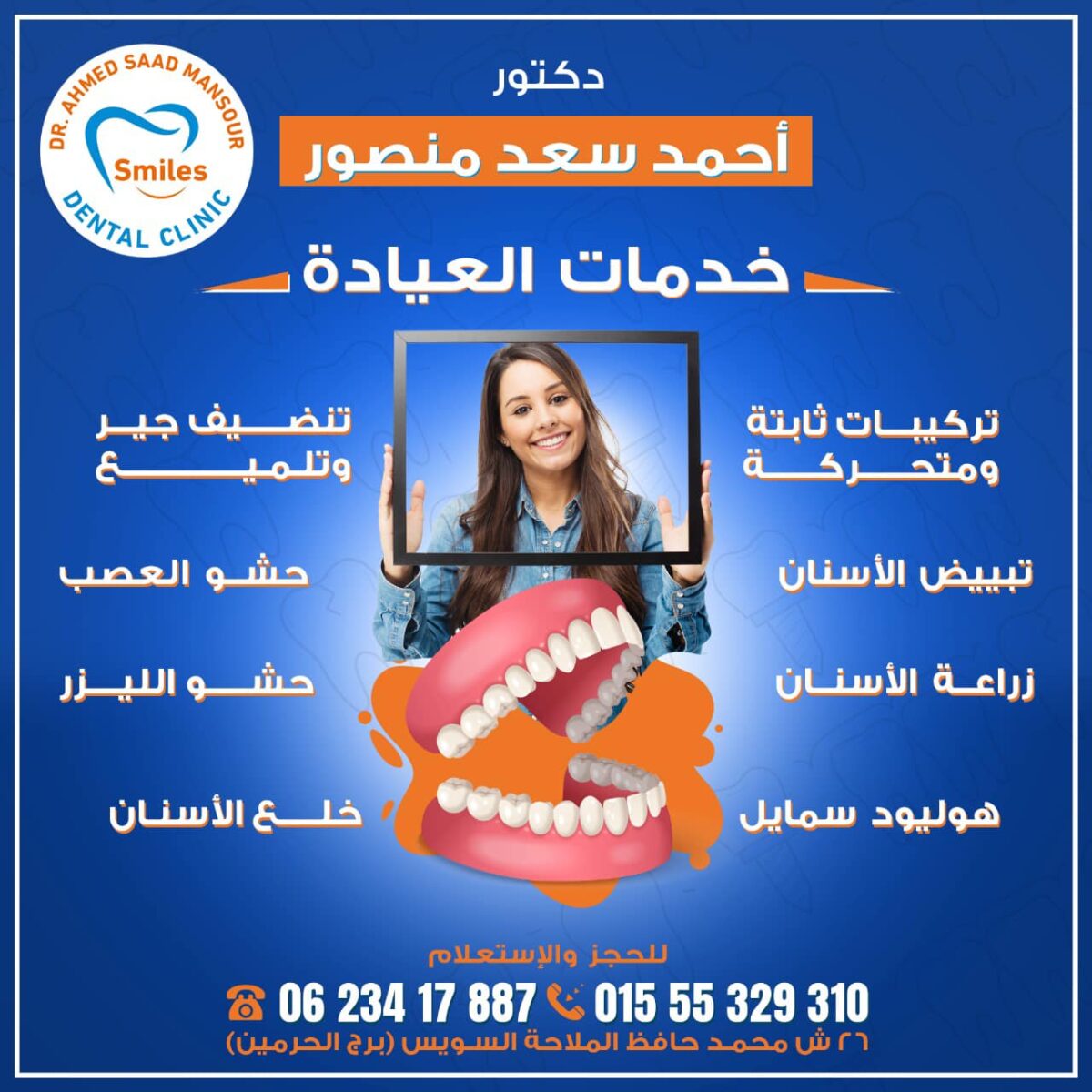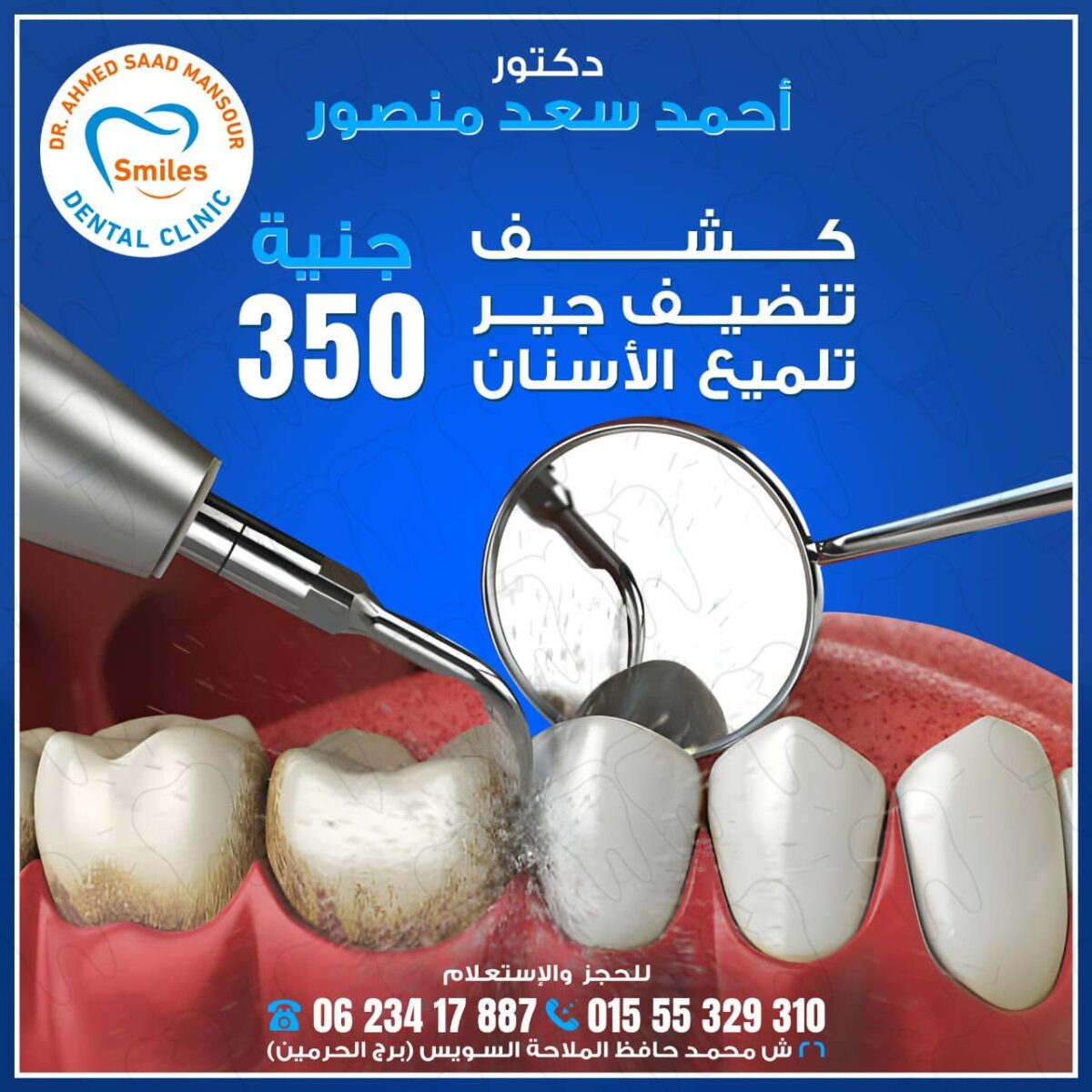 مواعيد Smiles Dental Clinic مع دكتور أحمد سعد منصور مرنة من الصبح لحد المغرب وحتى يوم السبت للحالات الطارئة. الحجز سهل عن طريق الواتساب أو الاتصال أو من خلال موقع العيادة الإلكتروني. ولو اضطرّيت تأجل موعدك، ممكن تعدّله قبل ٢٤ ساعة من غير أي رسوم إضافية. الأسعار شفافة وواضحة من البداية عشان تكون عارف التكلفة بالكامل قبل أول إجراء.