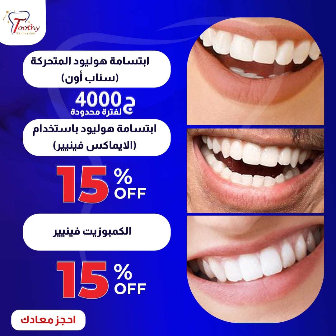 ببساطة، Toothy Dental Clinic بتمزج بين أحدث تقنيات الفحص والتنظيف والحشو والتبييض والتقويم والزراعة وعلاج اللثة، مع لمسة إنسانية وراحة نفسية حقيقية عشان تضمنلك تجربة علاجية متكاملة وابتسامة صحية وجميلة تدوم مدى الحياة.