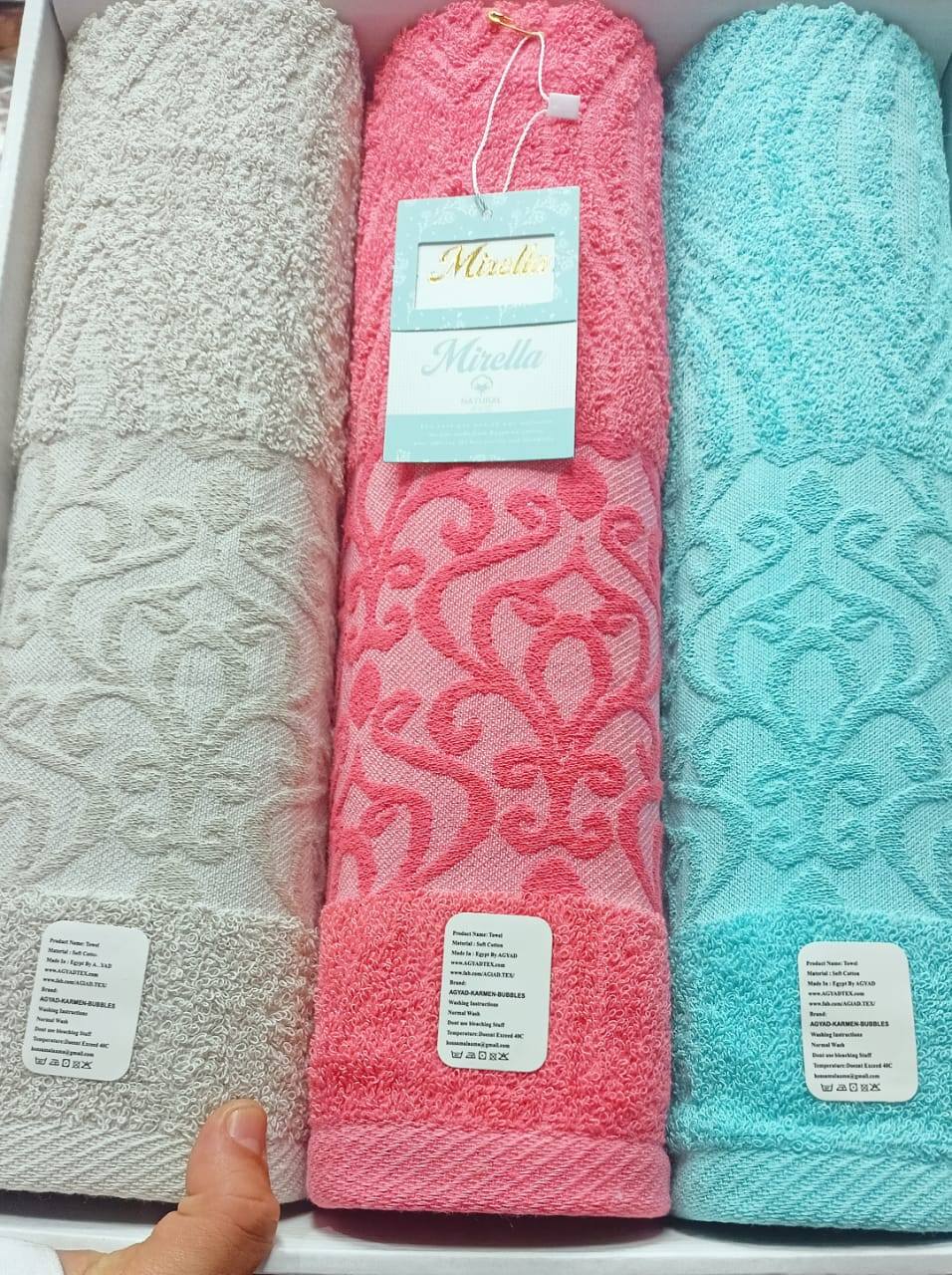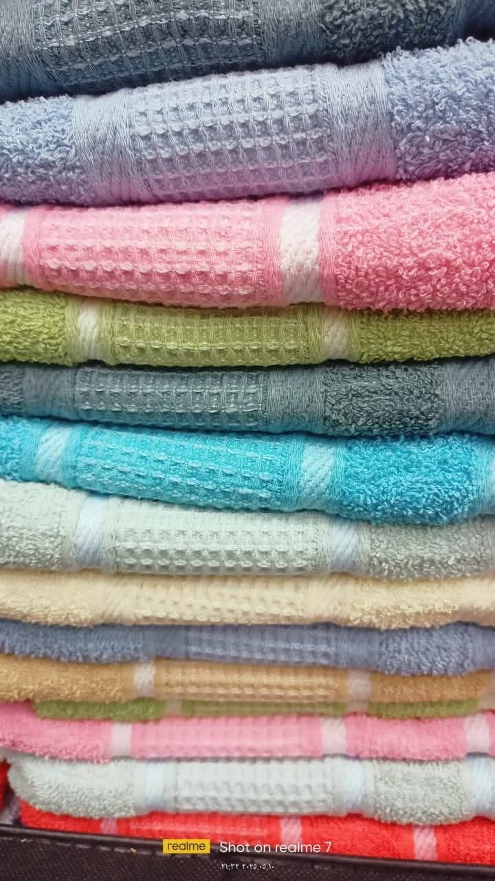 أطقم مناشف حمام ويد وشاطئ من قطن عالي الامتصاص، ناعمة على الجلد وتجف بسرعة. الألوان متناسقة مع باقي المفروشات، وتقدر تختار أطقم 3 أو 5 قطع للهدايا أو لتجهيز حمام العيلة. الخياطة متقنة والأطراف مقفولة كويس علشان تفضل محافظة على شكلها.