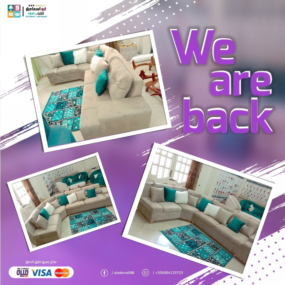 – ركنات “L” Modular: عند أبو إسماعيل هتلاقي تشكيلات modular مرنة ابتدي فيها بحبّة لوحدها وزوّد بعدين على قد المساحة والميزانية. التنجيد غالبًا “ميكروفايبر” تحس إنه مخملي لكن عملي وسهل التنضيف لو وقعت كباية شاي أو عصير.