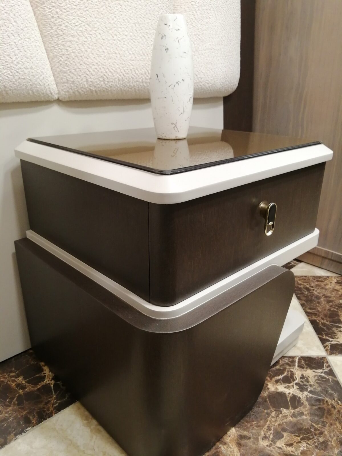 – يُستخدم خشب MDF عالي الكثافة أو زان طبيعي مصبوغ بدهان UV مات يثبت لسنين من غير بهتان.