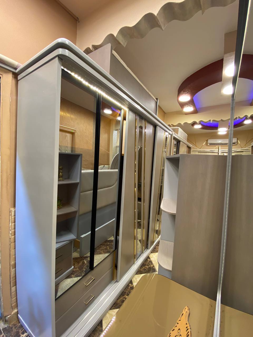 الدولاب Sliding Doors بواجهاته مرايات كاملة يضخ ضوء في الأوضة ويكبّرها بصريًا. التنظيم من جوّه بين رفوف قابلة للتعديل على حسب طول التياب، وأدراج Soft-Close ما تعملش دوشة لما تسحبها، وحِمالات مخصّصة للأوشحة والأحزمة. كأن صاحب الأوضة نفسه نظمها بنفسه في بيت الأحلام.