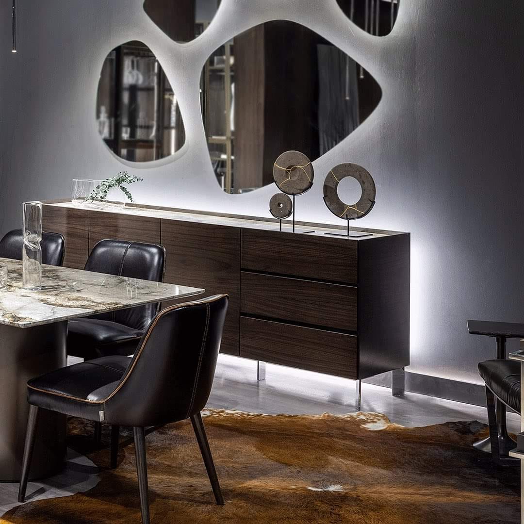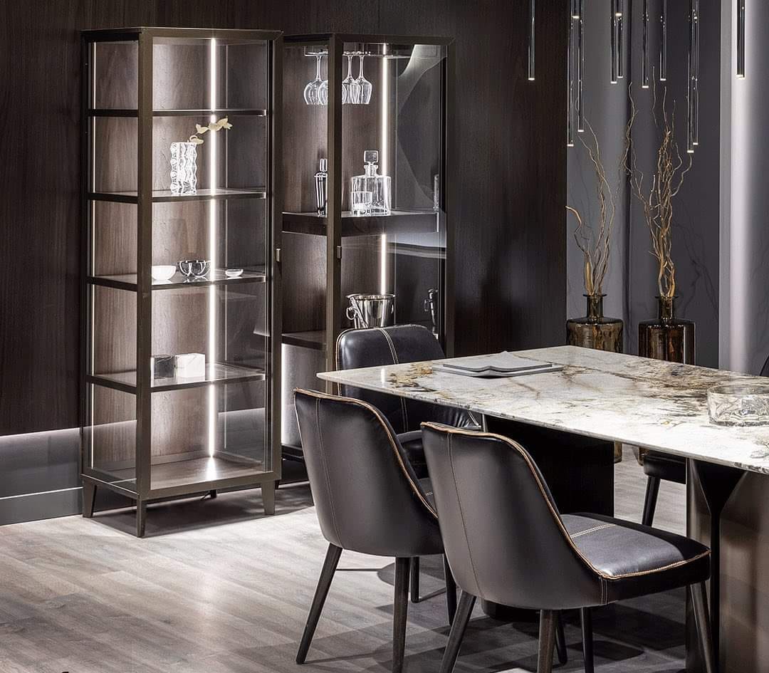 - بوفيه ونيش بواجهات Push-to-Open وأرفف خشب وزجاج لعرض أطقم السفرة والديكورات.