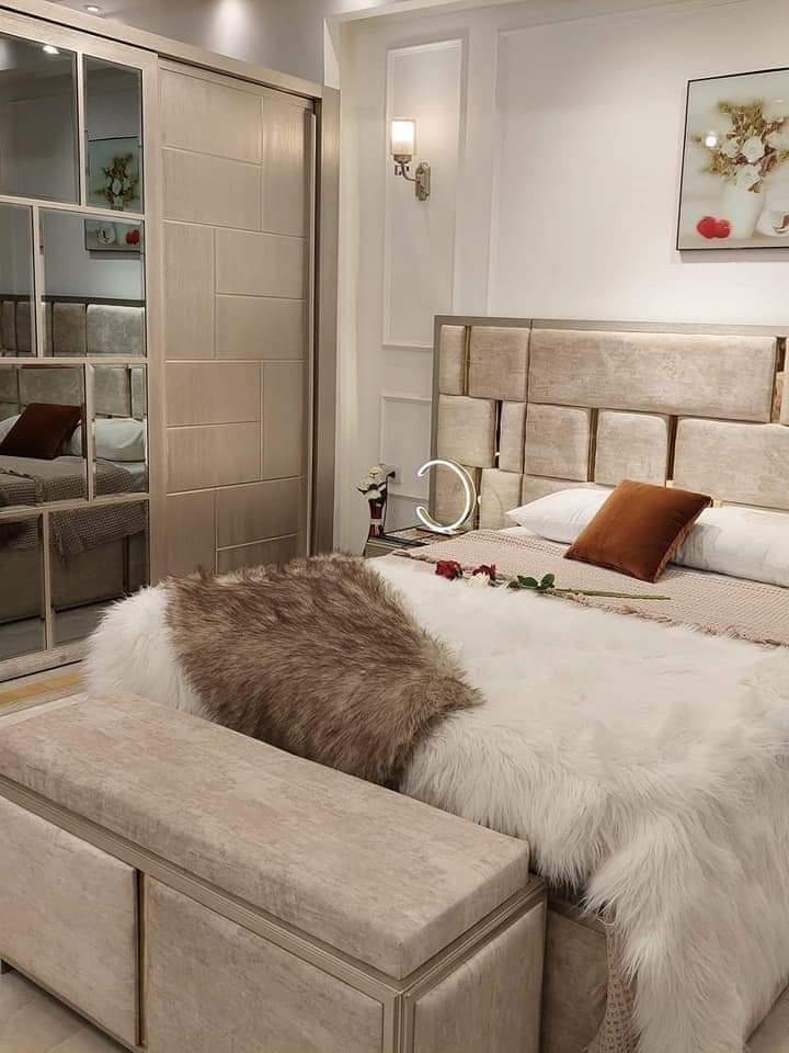 - دولاب Sliding Doors مراياه كاملة تكبّر الغرفة بصريًا، وتنظيمه الداخلي بين رفوف قابلة للتعديل وأدراج Soft-Close وحِمالات للهدوم.