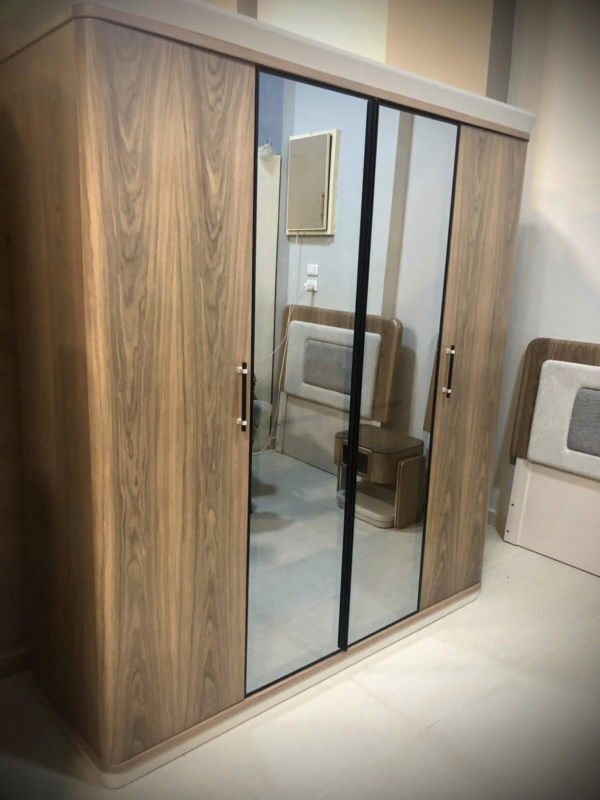 – دولاب Sliding Doors: واجهاته مرايا كاملة تكبّر الأوضة بصريًا، وتقسيمه الداخلي ذكي بين رفوف قابلة للتعديل وأدراج soft-close وحِمالات للهدوم، عشان كل حاجة تبقى في مكانها.