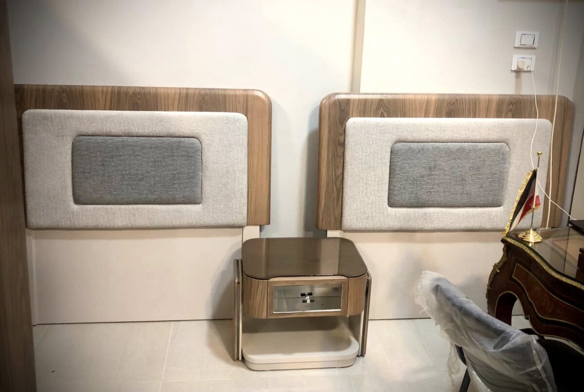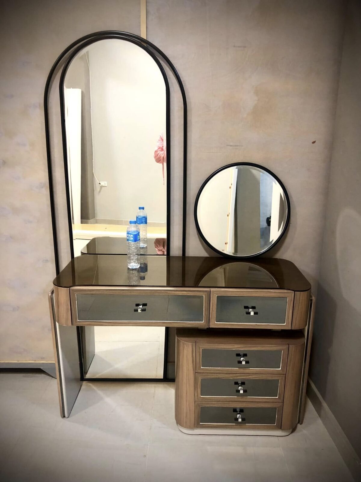 – كومودينو وتسريحة: الدروج بتشتغل بنظام soft-close هادي، ومساحات السطح مناسبة للأباجورة والمقتنيات الشخصية ومستحضرات الزينة.