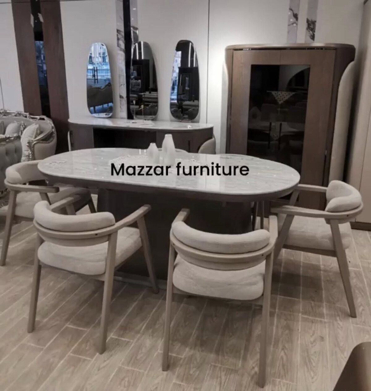 – كراسي Dining: مدعمة ظهرها منحني بشكل ergonomic يريح العمود الفقري في جلسات العيلة الطويلة، وتنجد مبطن عملي وسهل التنضيف من غير دوشة.