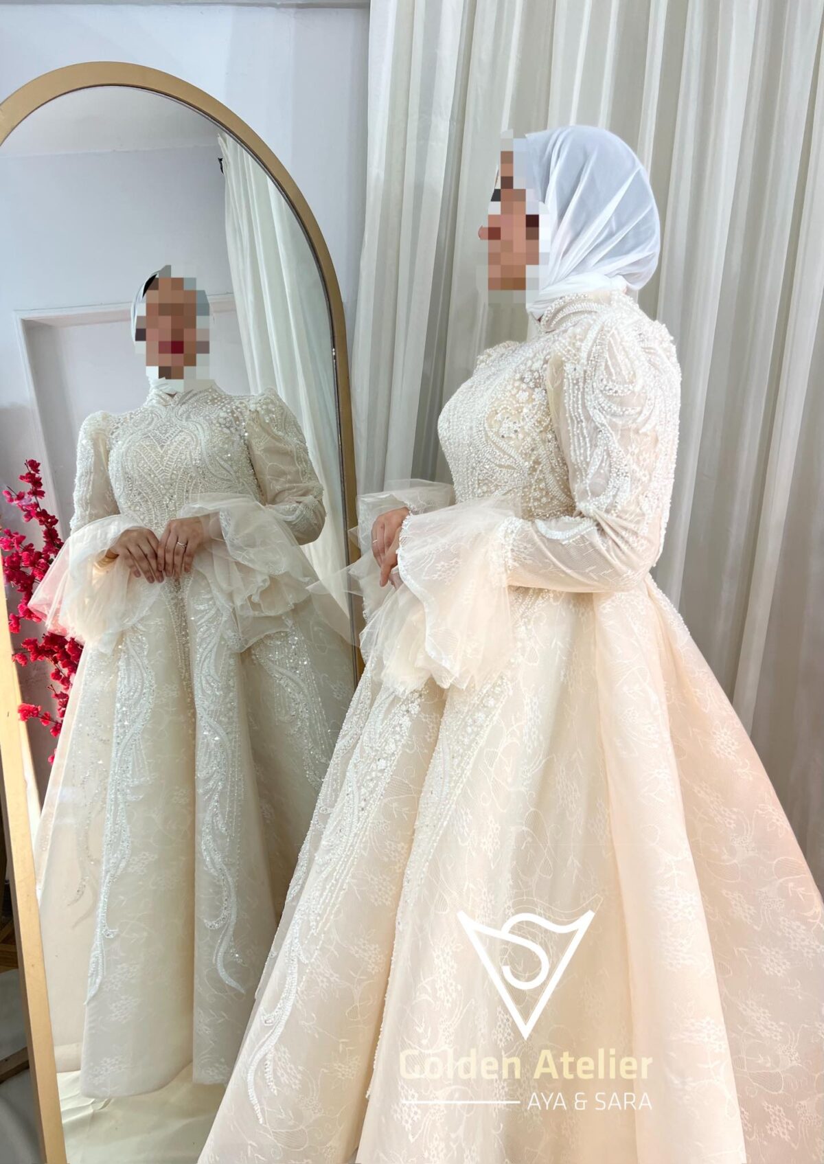 التجربة نفسها في المكان مرتّبة وهادية. العروسة بتجرب الموديلات براحتها وتشوف كل تفاصيلها وهي لابساه، وده بيساعدها تاخد قرارها من غير استعجال. ساعات البنت تدخل مقتنعة بموديل معين، وتكتشف إن موديل تاني هو الأنسب ليها، وساعات كمان الموديل اللي كانت مستبعداه يطلع هو الأجمل عليها. Golden Atelier بيدي للعروسة المساحة إنها تشوف نفسها بوضوح وتاخد القرار وهي مرتاحة.