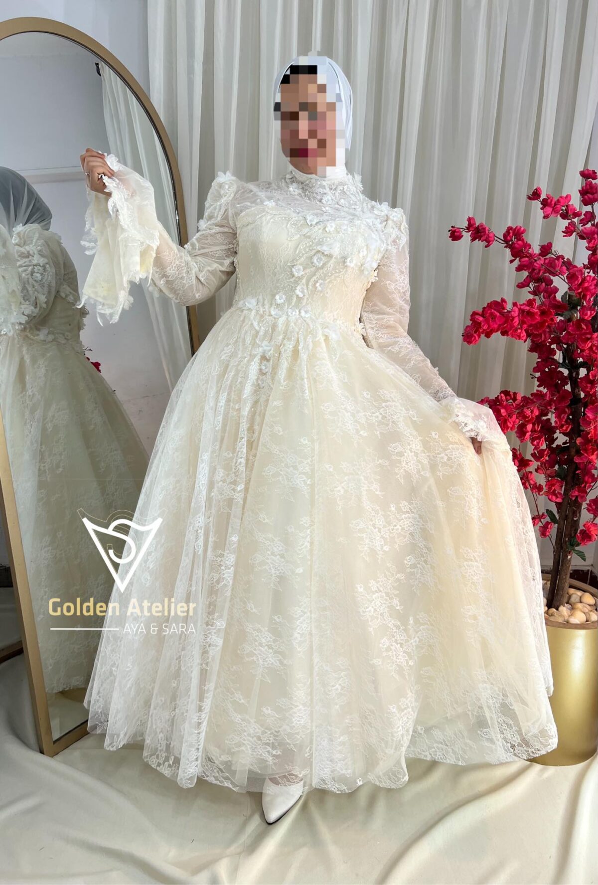 الموديلات اللي موجودة في Golden Atelier بتتنوع في الخامات والتفاصيل. في فساتين دانتيل ناعمة تناسب البنات اللي بتحب اللوك الرقيق، وفي موديلات فيها شغل خفيف مطرّز بخيط بسيط يدي لمسة فخمة من غير مبالغة، وفي خامات تل خفيفة بتدي حركة جميلة ومناسبة للبنات اللي عايزين فستانهم يبقى مريح وفي نفس الوقت شكله لافت. التنوع ده بيساعد العروسة تشوف نفسها في أكتر من شكل وتختار اللي يناسب جسمها وشخصيتها.