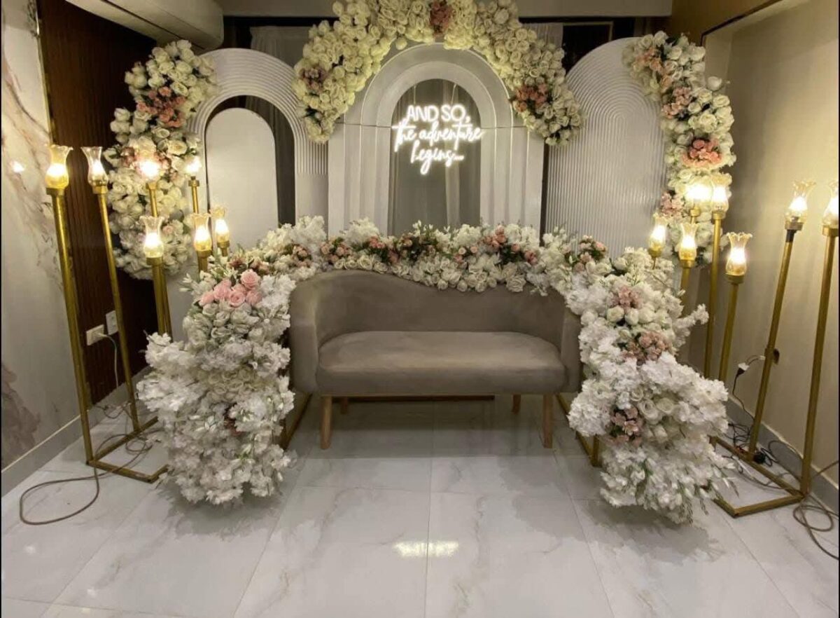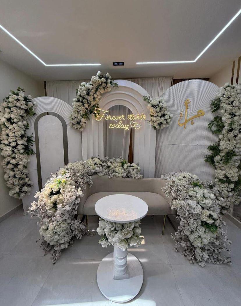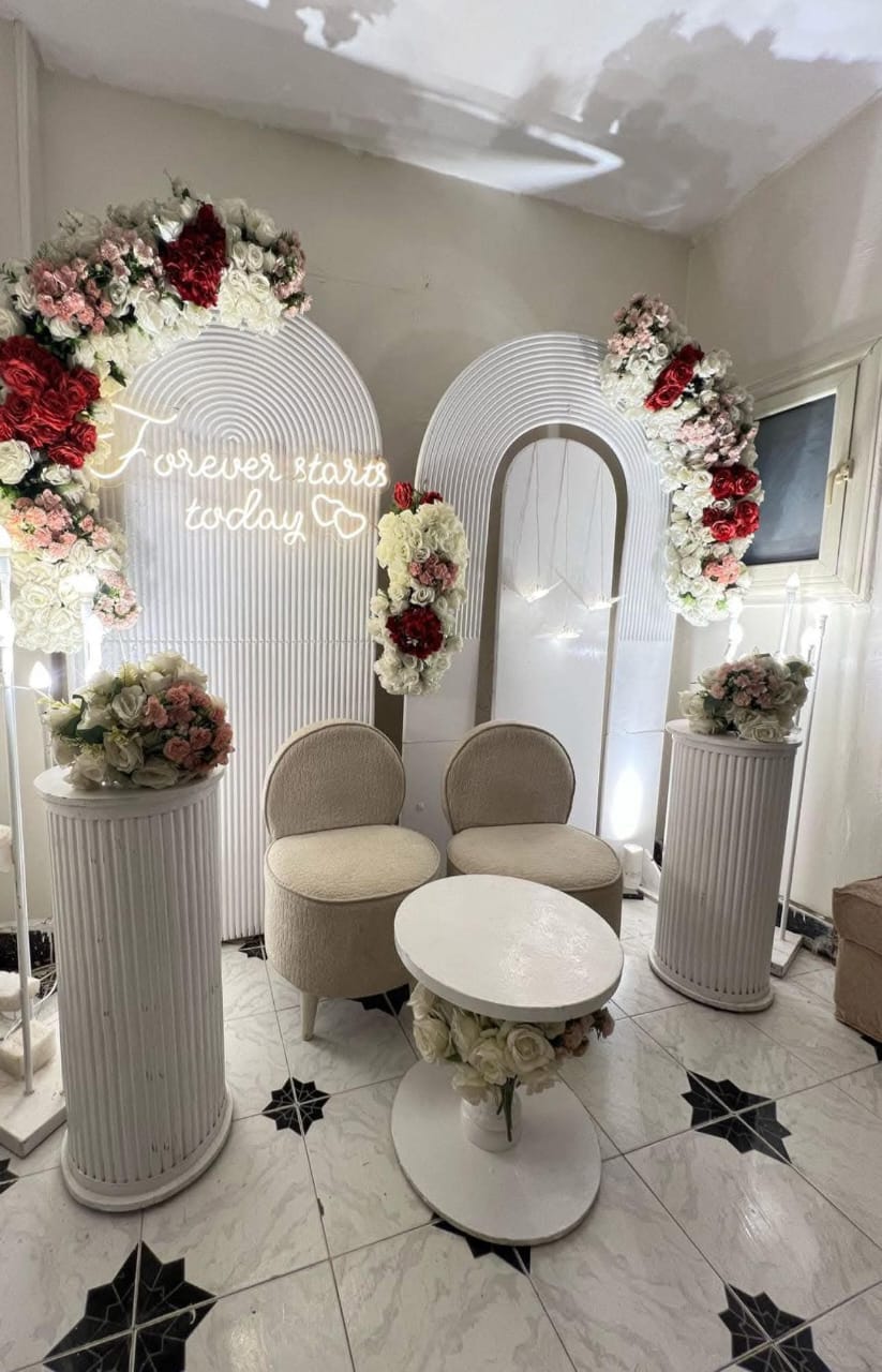 التنسيق عندها دايمًا فيه لمسة خاصة. مش مجرد ورود وألوان، لكن تناسق بيخلي القاعة شكلها مريح للعين، وكل ركن فيها باين إنه متصمم بفكرة. حتى الكوشة بتكون لها طابع، والمداخل فيها شكل غير تقليدي، وكل حاجة بتكون بتعبر عن العروسة وشخصيتها.