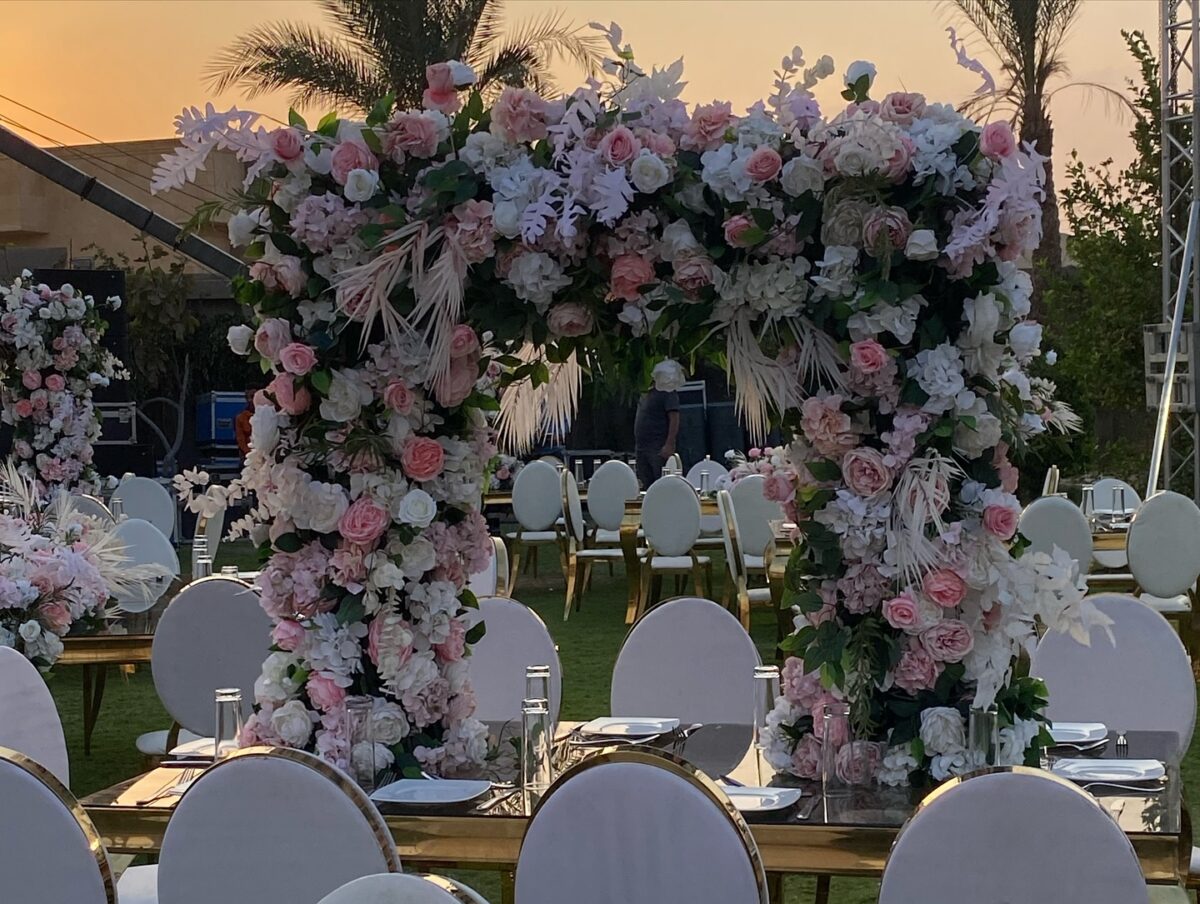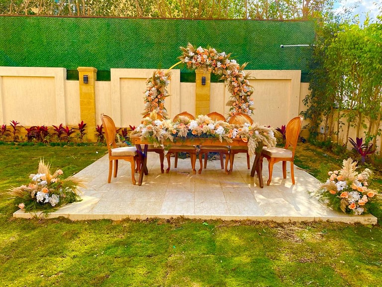 من ناحية الميزانية، By Meral Elkady عندها مرونة كبيرة وبتقدر تشتغل على كل المستويات. بتقترح أفكار ذكية تخلي الشكل النهائي يطلع فخم جدًا من غير تكلفة عالية. ممكن تعتمد على ورود موسمية بدل المستوردة، أو تستخدم الإضاءة بشكل فني يغني عن ديكورات مكلفة، وفي النهاية الشكل بيطلع راقي وأنيق جدًا.