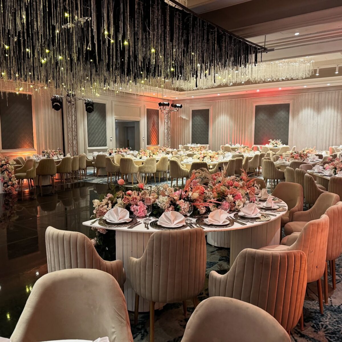 الفريق اللي بيشتغل معاها معروف بالالتزام والاحتراف. بيتعاونوا مع المصورين، الدي جي، الكاترينج، وشركات الإضاءة بخطة محكمة ومتابعة مستمرة. قبل الفرح بيجهزوا Check-list فيها كل التفاصيل الصغيرة: ترتيب الطاولات، توقيت الفقرات، حركة الخدمة، والإضاءة. التنظيم ده بيخلي اليوم كله ماشي بانسيابية، والعروسين يعيشوا اللحظة من غير أي ضغط.