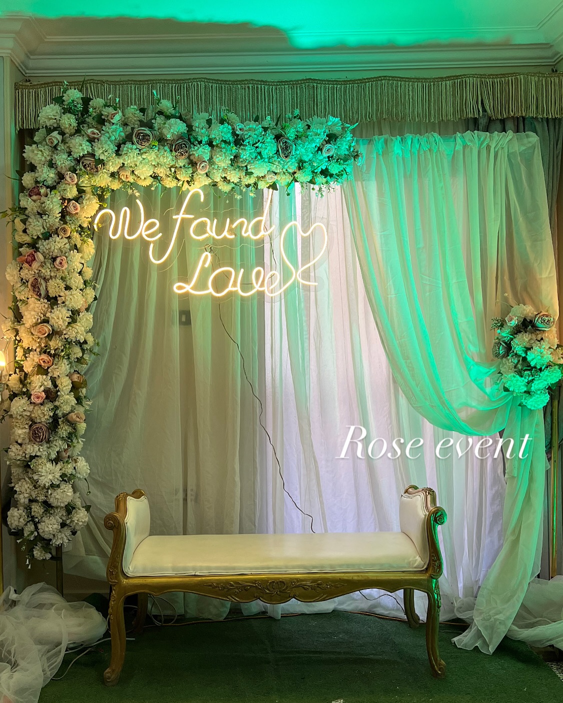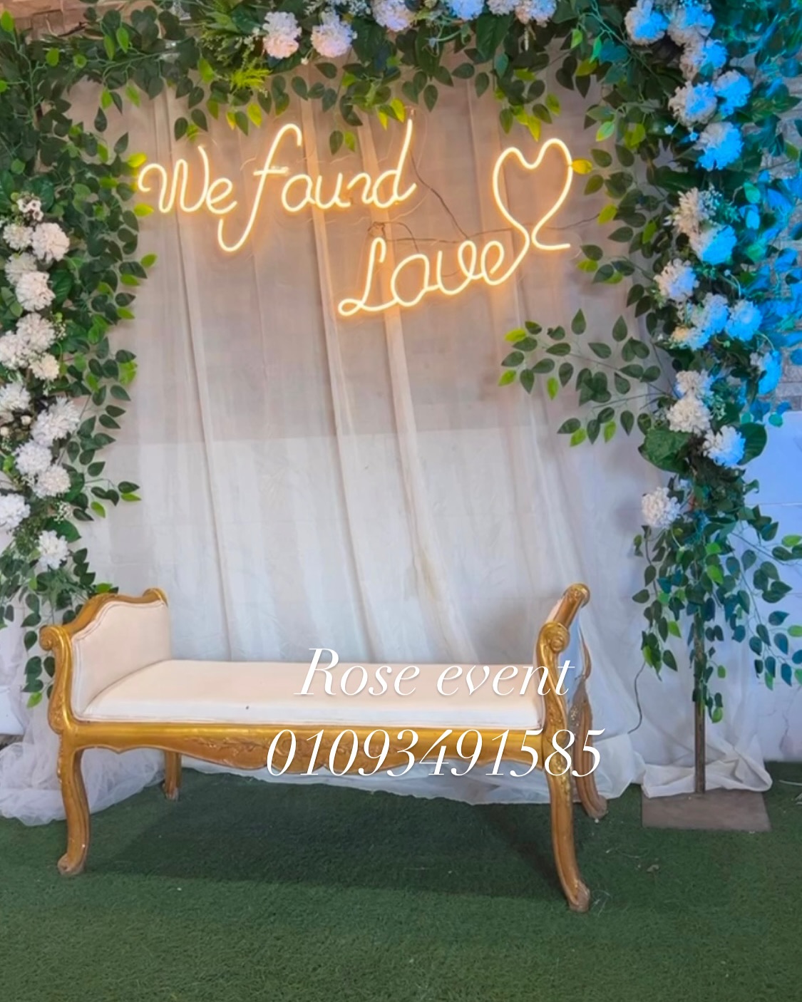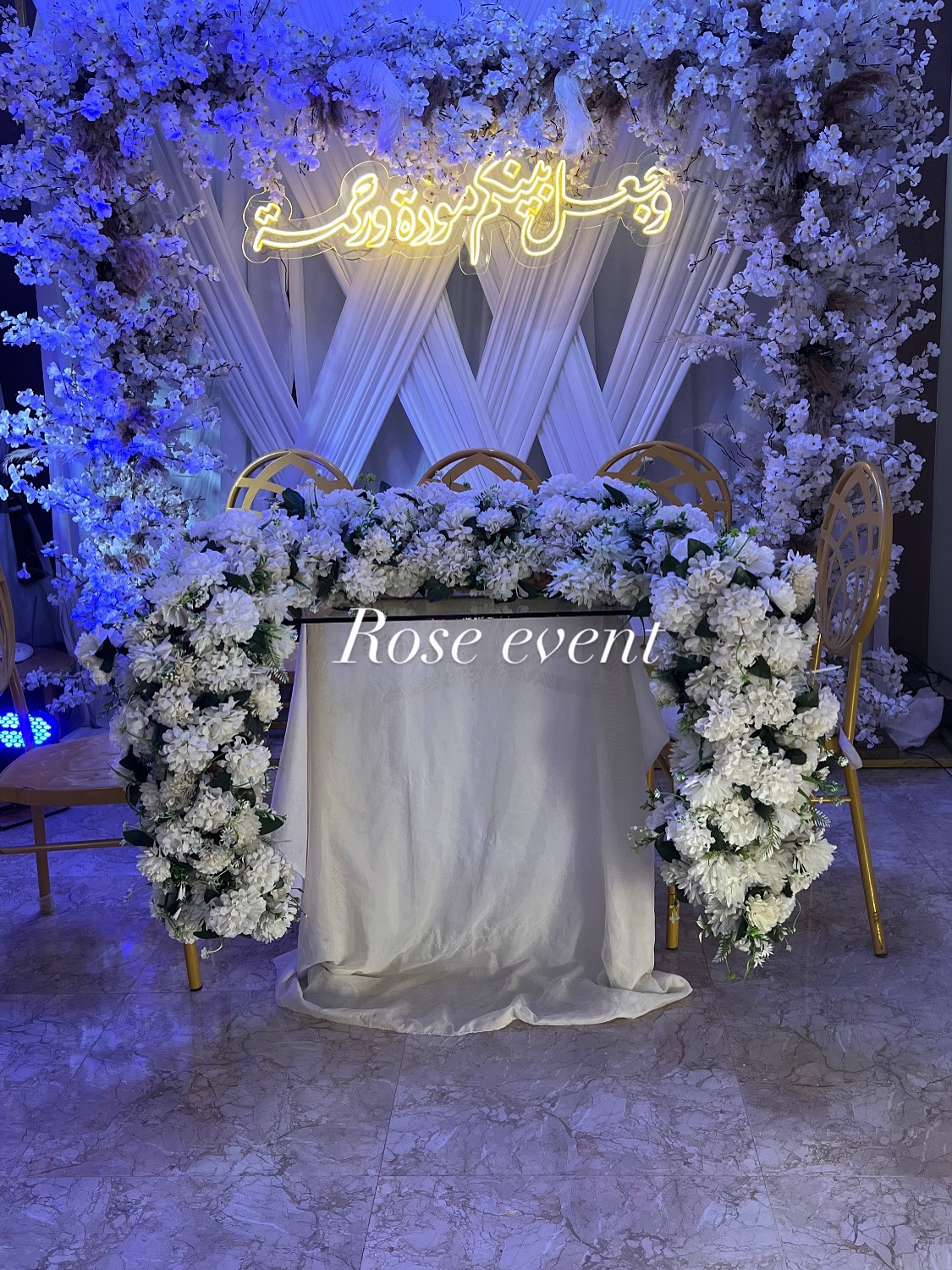 الديكور عند Rose Event دايمًا هو العلامة المميزة. الكوشة عندهم بتتصمم بعناية فائقة، فيها ذوق راقي وألوان متناغمة تليق بشخصية العروسين. الطاولات بيتعمل لها تنسيق شيك بأزهار وإضاءة بسيطة تدي جو مبهج ومريح. أما ركن التصوير فبيتعامل بذوق فني عالي يخلي الصور كلها مليانة حياة وبهجة. بيحبوا دايمًا يشتغلوا على تفاصيل طبيعية وناعمة من غير أي مبالغة.
