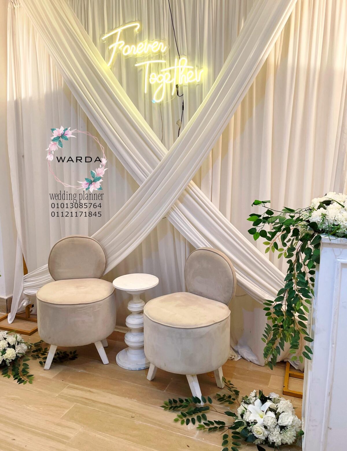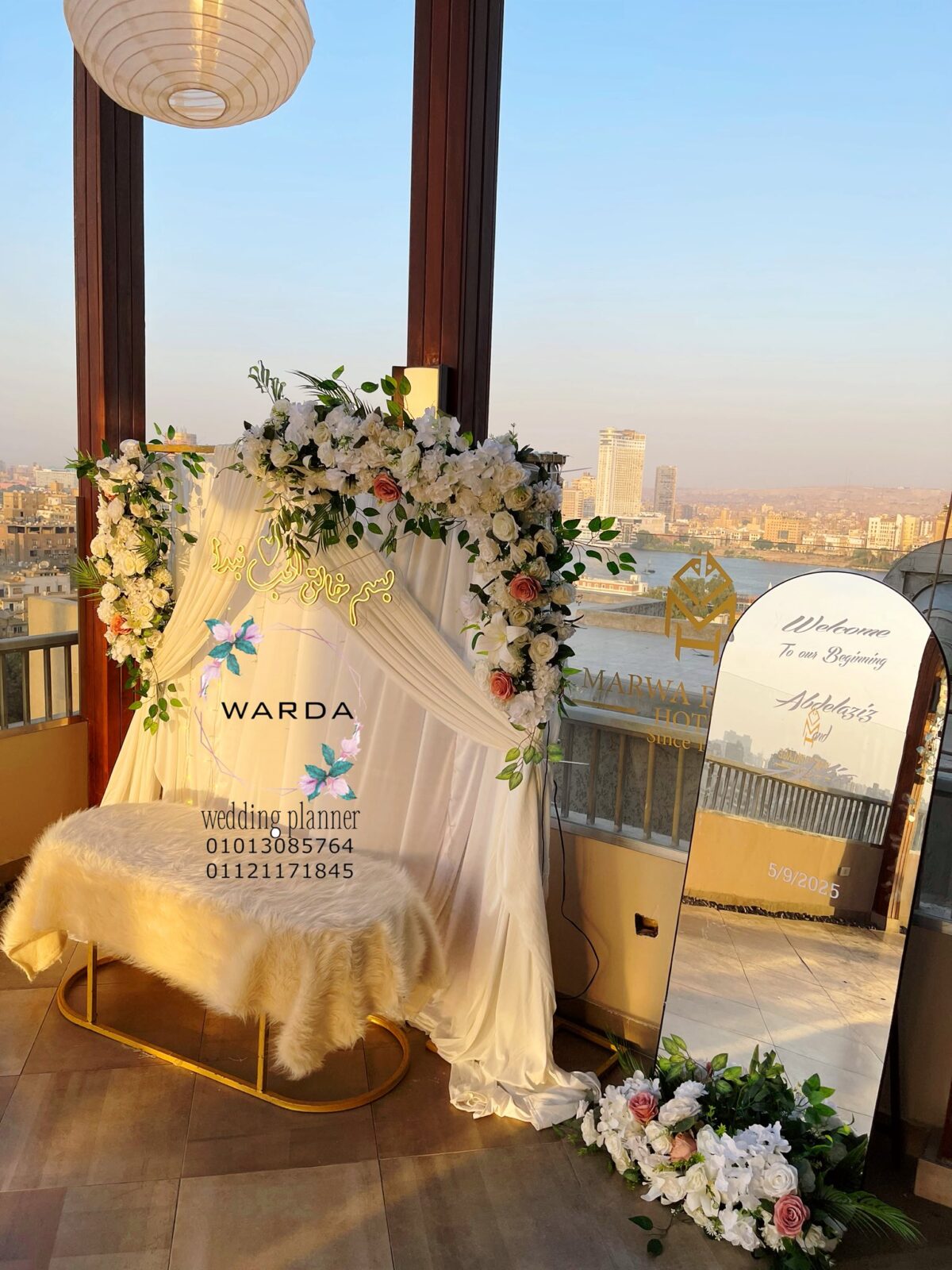 الديكور بالنسبالها هو أول حاجة بتخلق الانطباع. بتحب دايمًا تستخدم الورود الطبيعية والألوان الهادية علشان المكان يدي إحساس بالراحة والرومانسية. الكوشة عند Warda بتكون دايمًا أنيقة جدًا من غير أي مبالغة، الطاولات بتتنسق بذوق بسيط لكن متقن، والإضاءة بتتوزع بعناية علشان كل زاوية في القاعة تبان بجمالها. أما ركن التصوير فبيكون معمول بطريقة فنية تخلي الصور كلها شكلها طبيعي ومليان مشاعر.