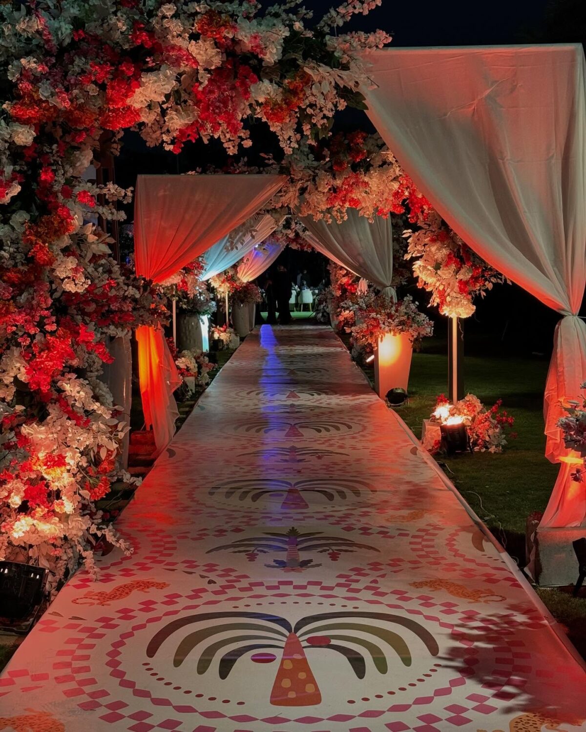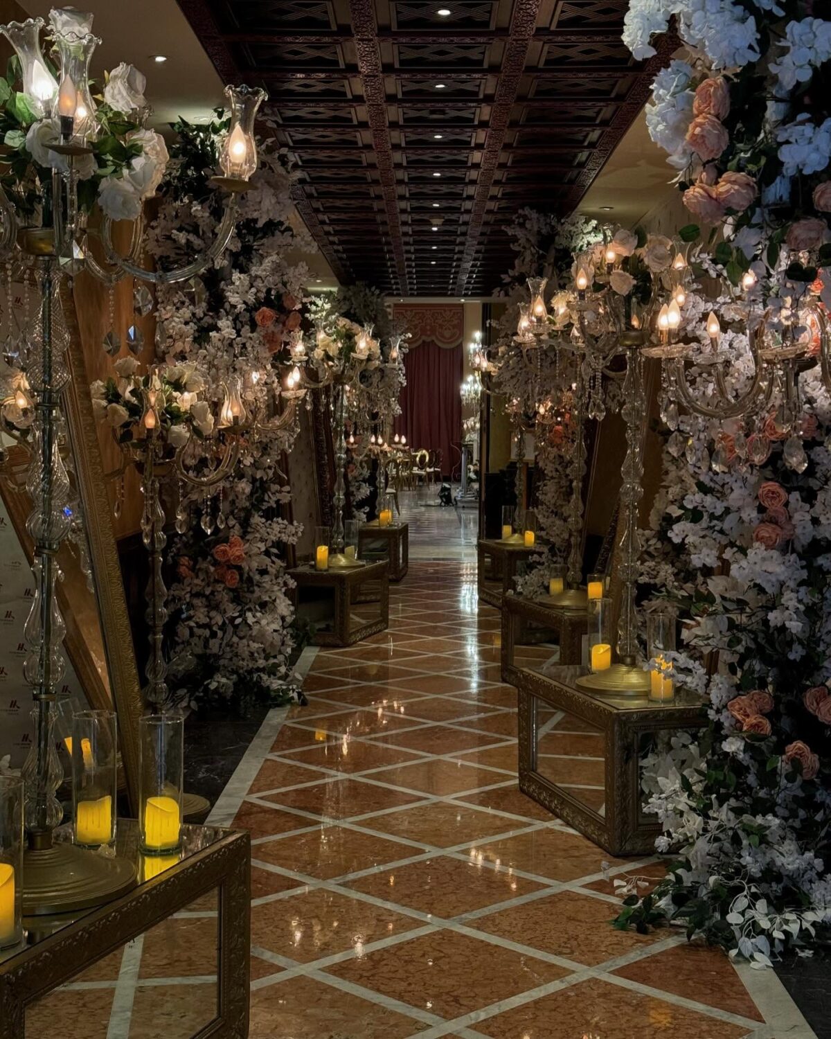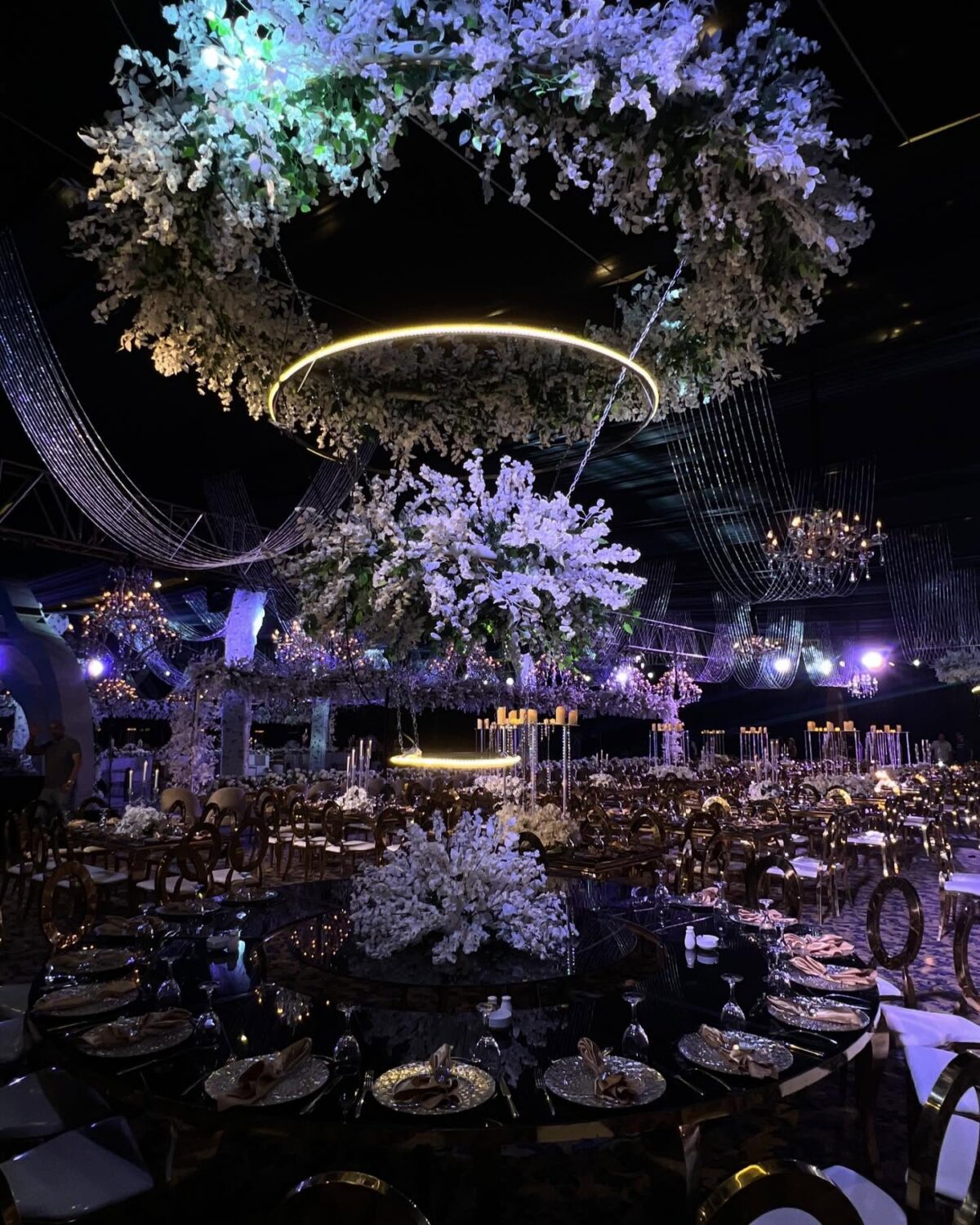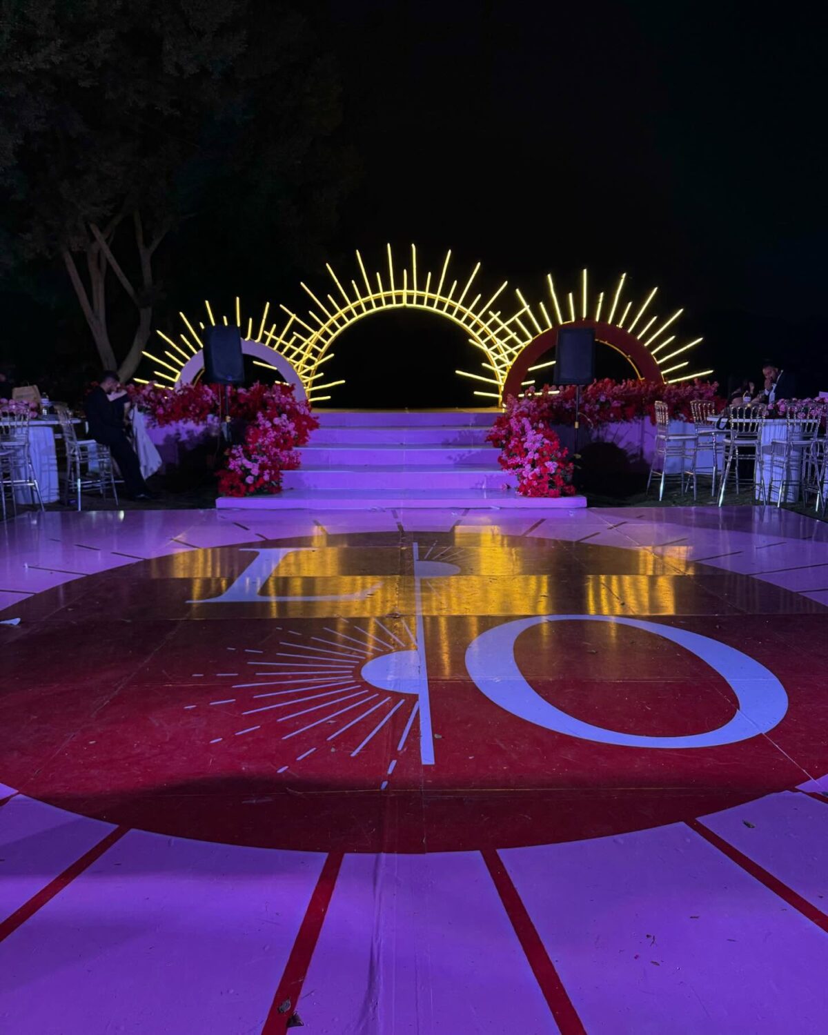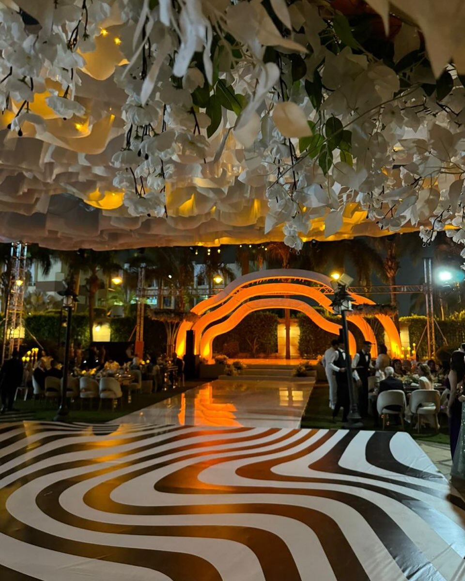 الإضاءة بالنسبالهم عنصر أساسي مش بيتساب للصدفة. بيستخدموها علشان يغيروا المود بتاع المكان على حسب كل لحظة. في الرقصة الأولى الإضاءة بتكون هادية ورومانسية، أما في الزفة والفقرات بتتحول لإضاءة مليانة حركة وألوان مبهجة. التناغم بين الإضاءة والديكور بيخلي المكان كله شكل واحد متكامل وساحر.