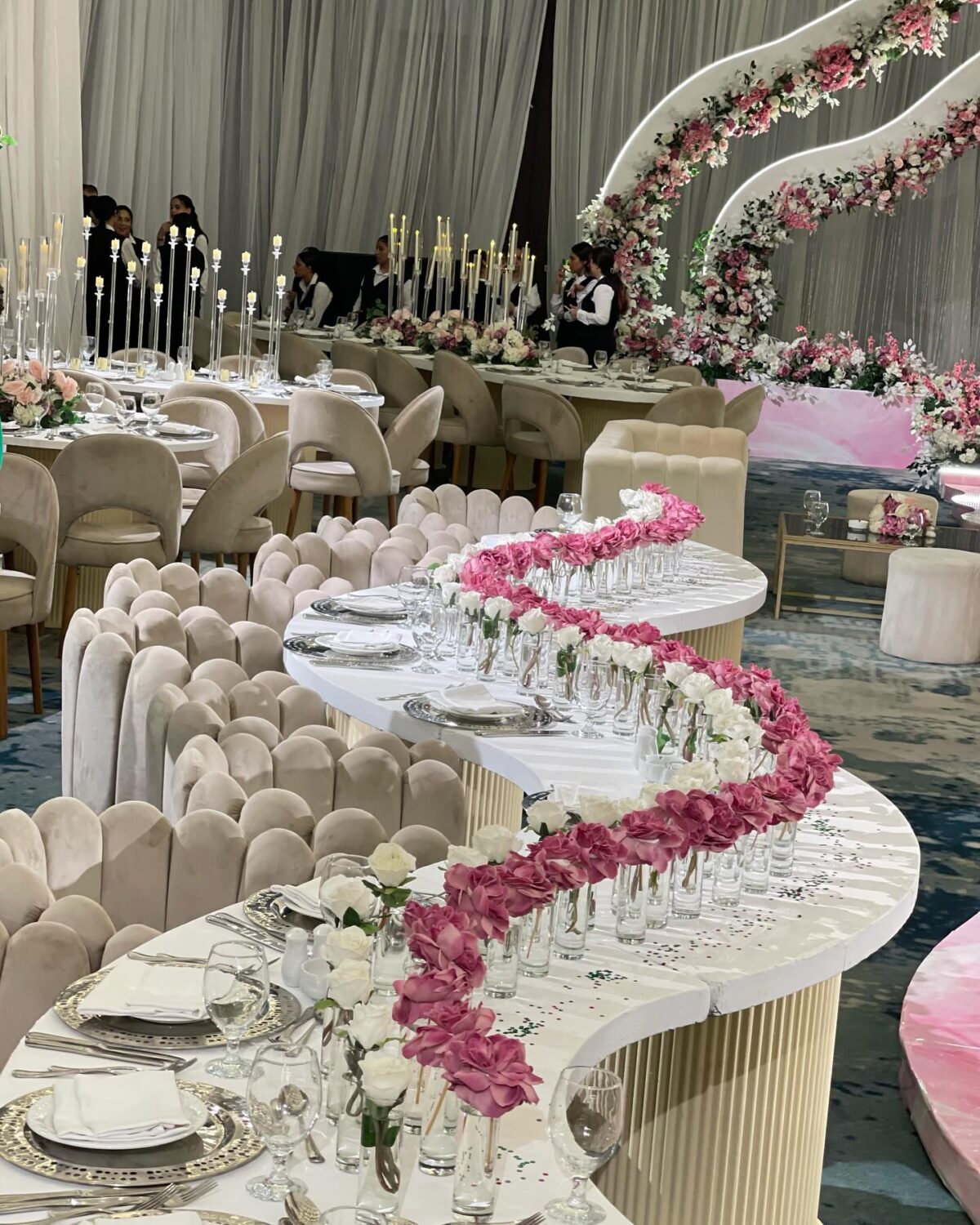 الديكور عند Rosa Event Planning بيجمع بين البساطة والفخامة. بيحبوا التفاصيل الأنيقة اللي تدي للمكان روح مبهجة من غير أي مبالغة. الكوشة عندهم دايمًا بتكون متصممة بذوق ناعم جدًا، الطاولات بتتنسق بعناية، والإضاءة بتتوزع بطريقة تبرز جمال القاعة من كل زاوية. أما ركن التصوير فبيتعامل كأنه مشهد فني، معمول بإبداع يخلي الصور كلها فيها طاقة وحياة.