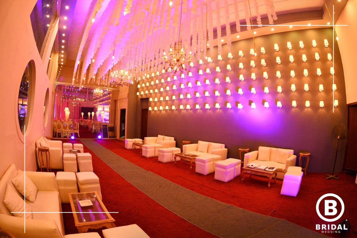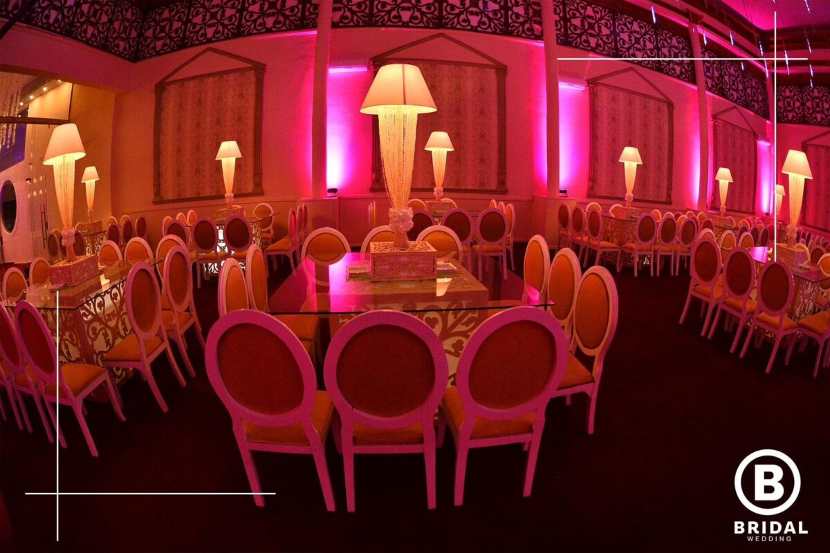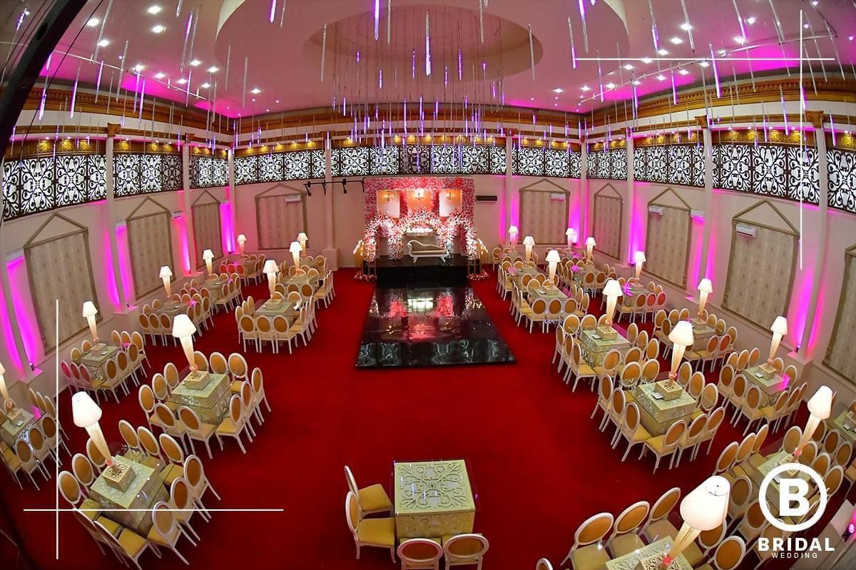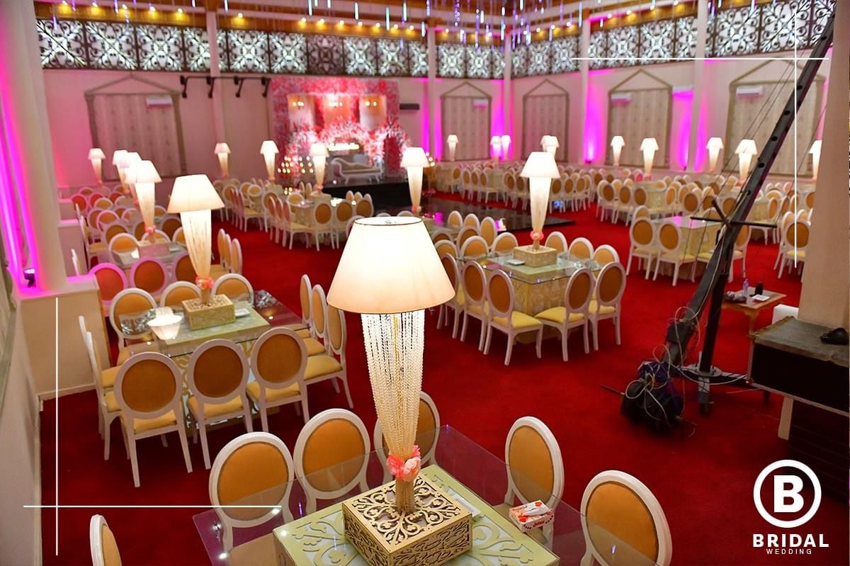 القاعة بديكورات مميزة تجمع بين الفخامة واللمسة العصرية، مع ألوان وإضاءات بتخلق أجواء راقية تناسب كل أنواع الحفلات.