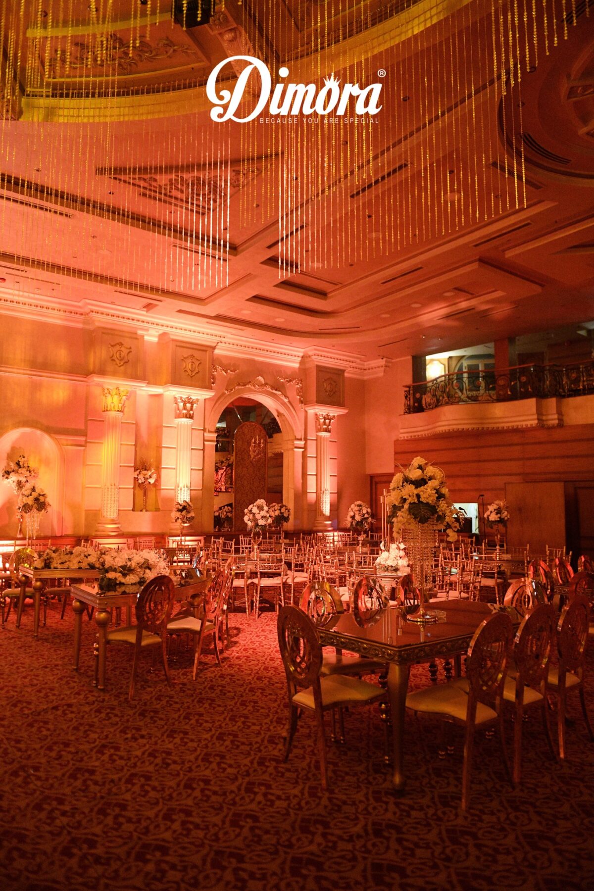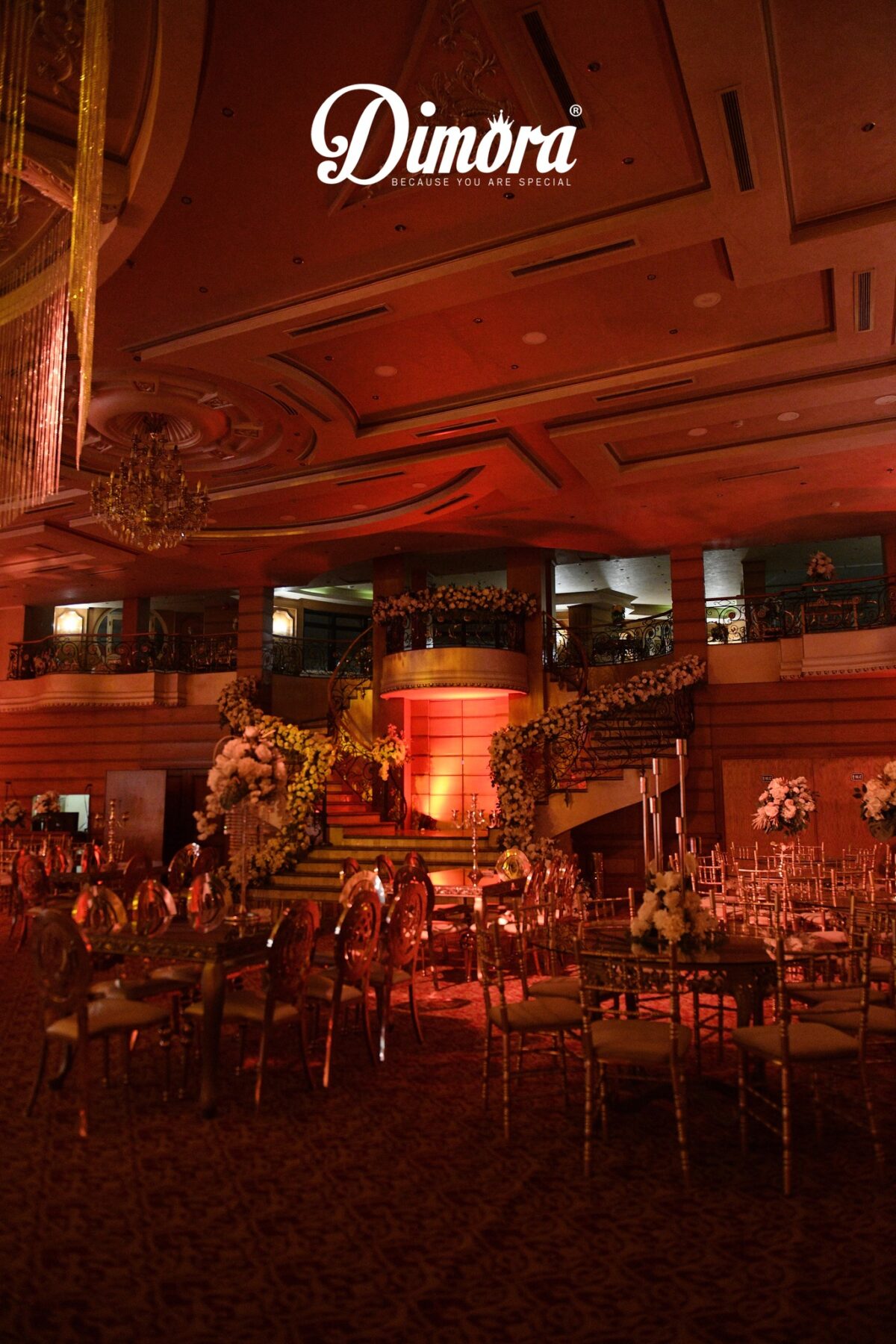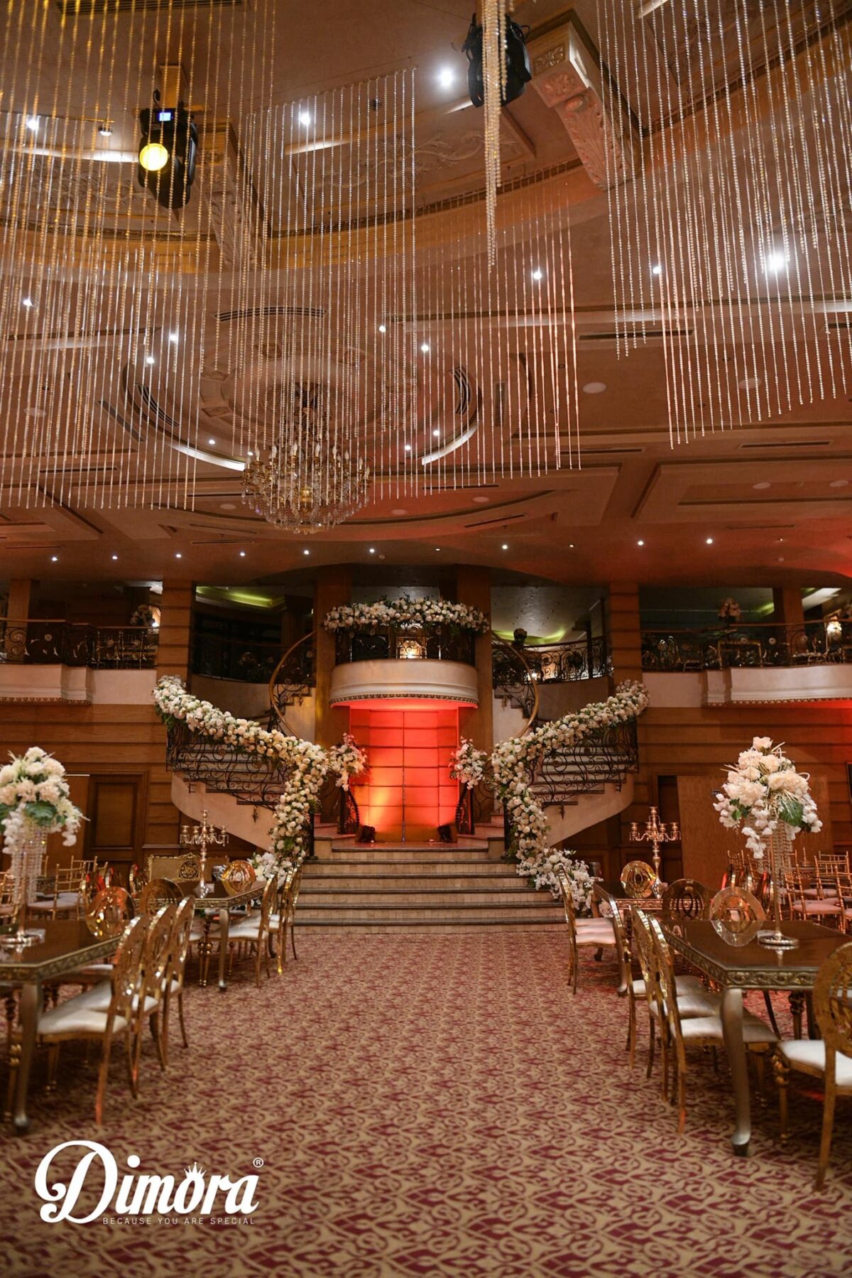 القاعة نفسها بتدي إحساس بالاتساع والراحة. الإضاءة موزونة ومريحة للعين، والديكور نضيف ومعتمد على الألوان الفاتحة اللي بتخلي شكل المكان كله منور. الكوشة دايمًا بتتعمل بذوق يتماشى مع شكل القاعة، سواء تصميم ناعم بورود بسيطة، أو مودرن بالاعتماد على الإضاءات، أو شكل رومانسي بألوان هادية. التفاصيل في Dimora مش كتير، لكنها واضحة وتبان في الصور بشكل جميل من غير مبالغة.