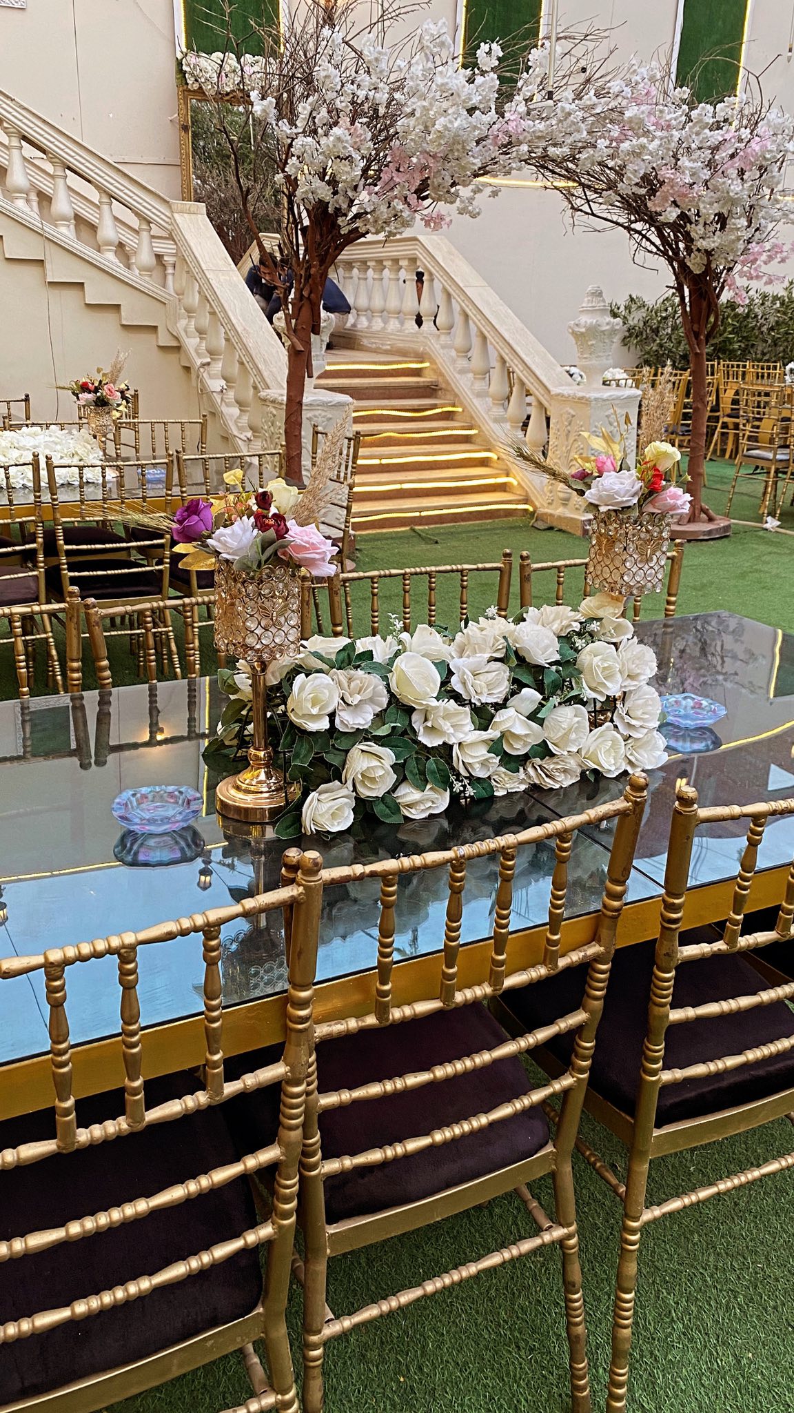 تقدر تضيف ورود طبيعية أو إضاءات ناعمة حسب ثيم الحفلة أو المناسبة
