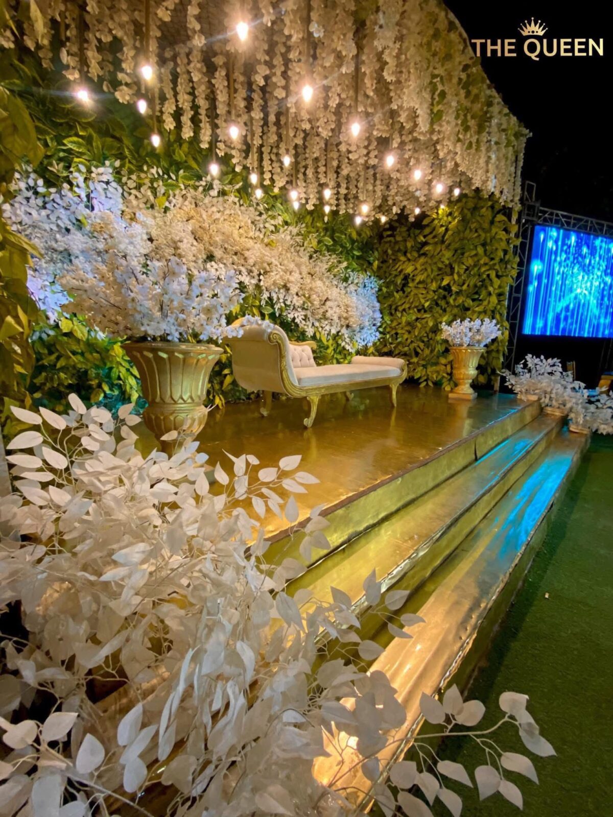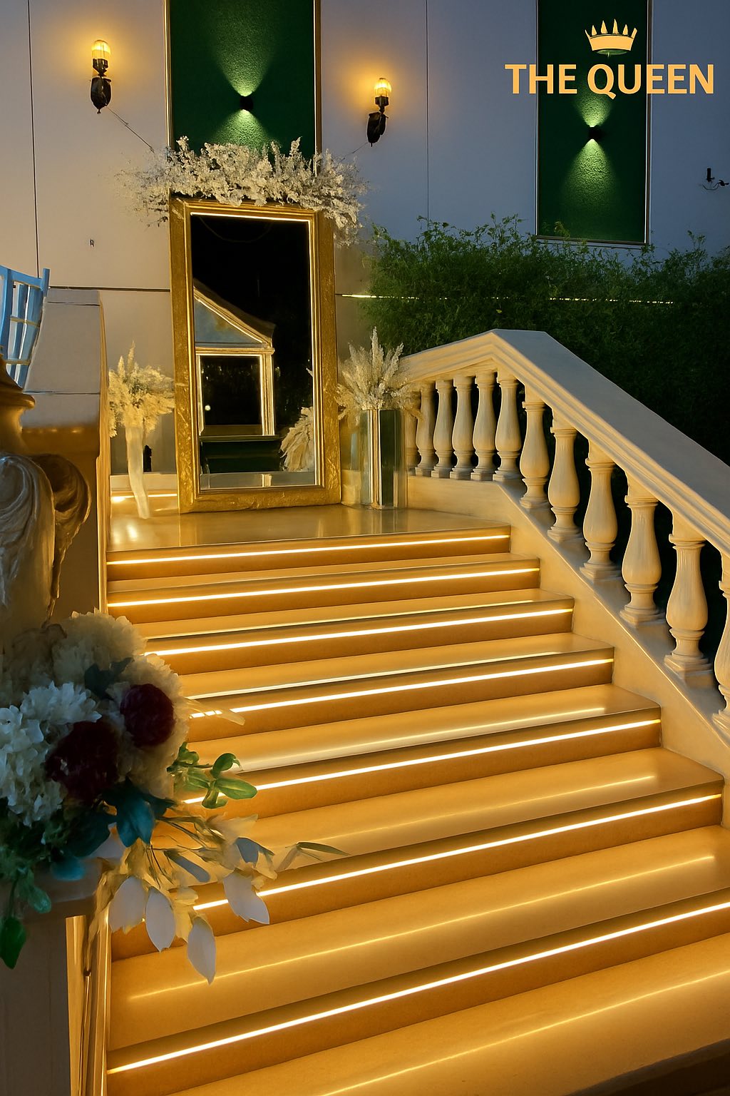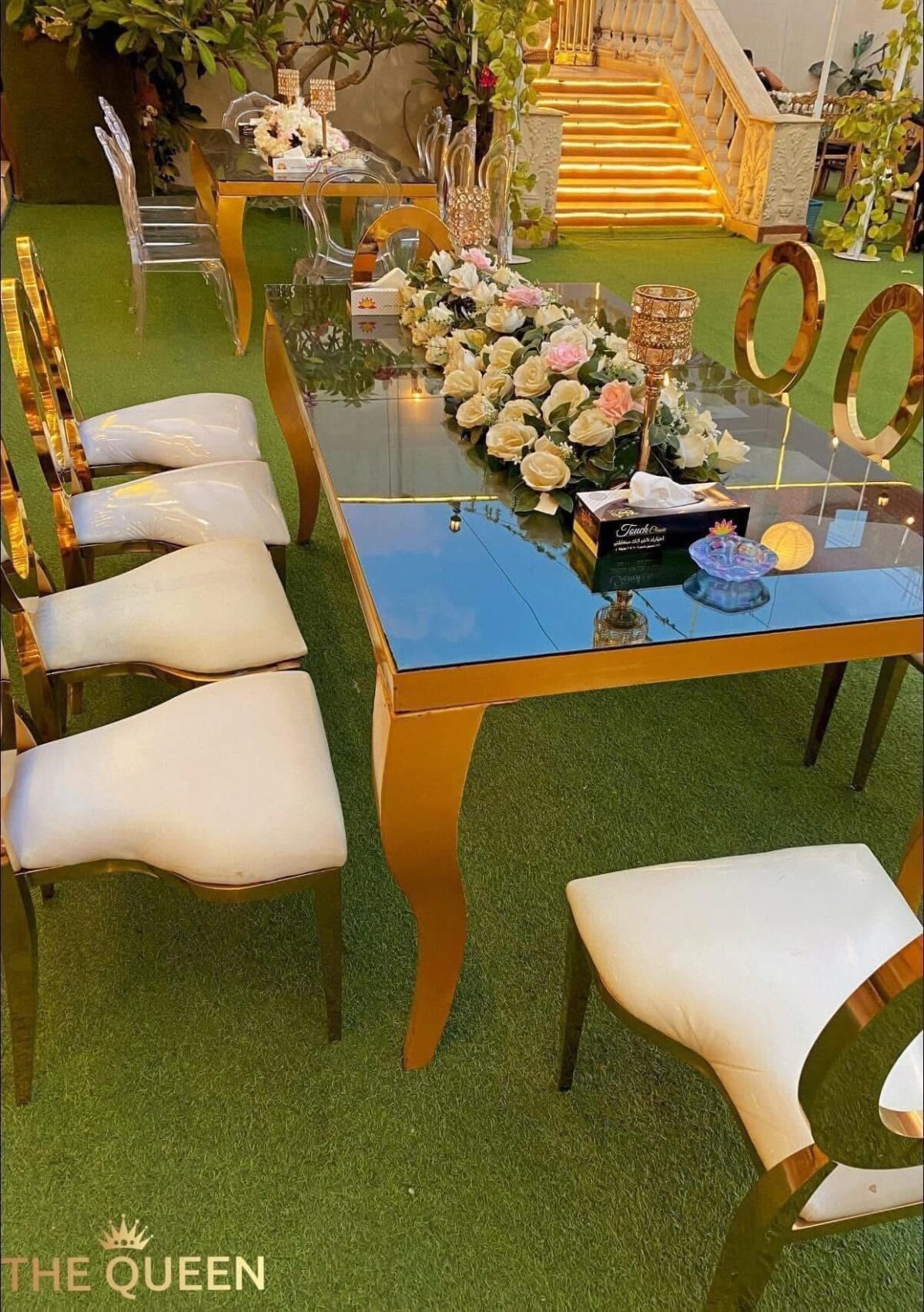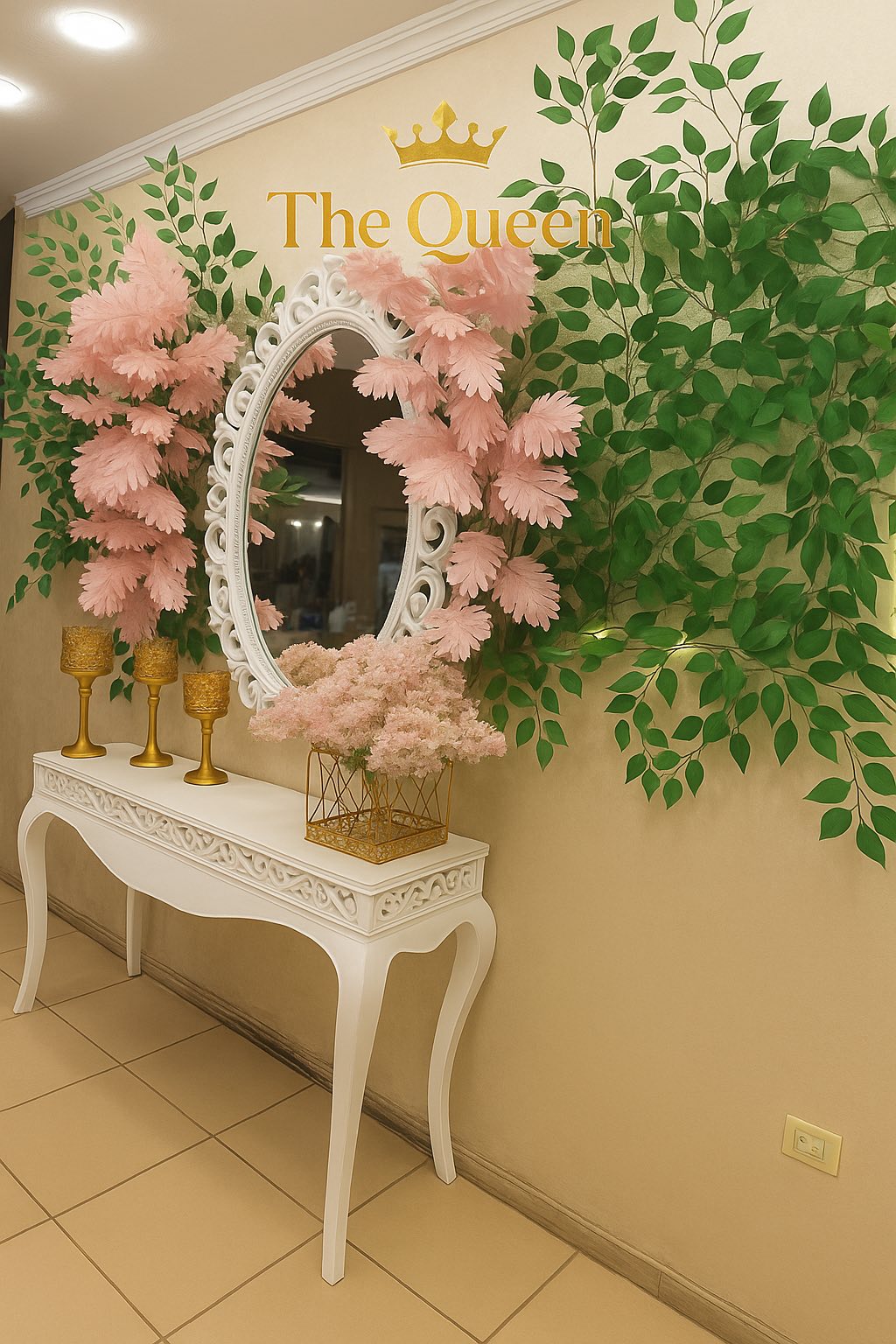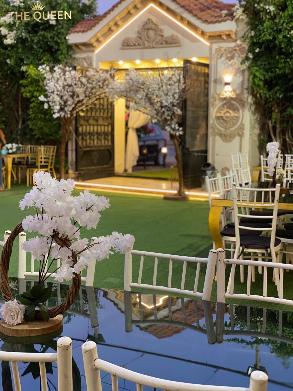 الديكور في قاعة ذا كوين بيعتمد على البساطة بألوان هادية زي الأبيض والكريمي مع لمسات بسيطة من اللون الذهبي أو الفضي