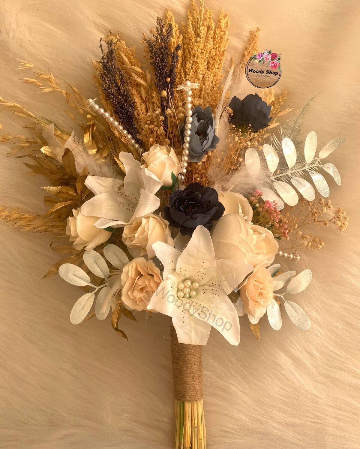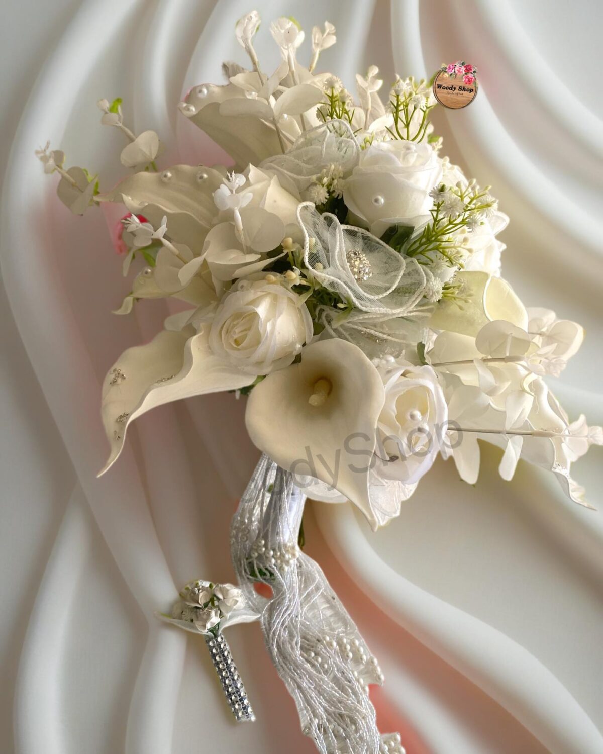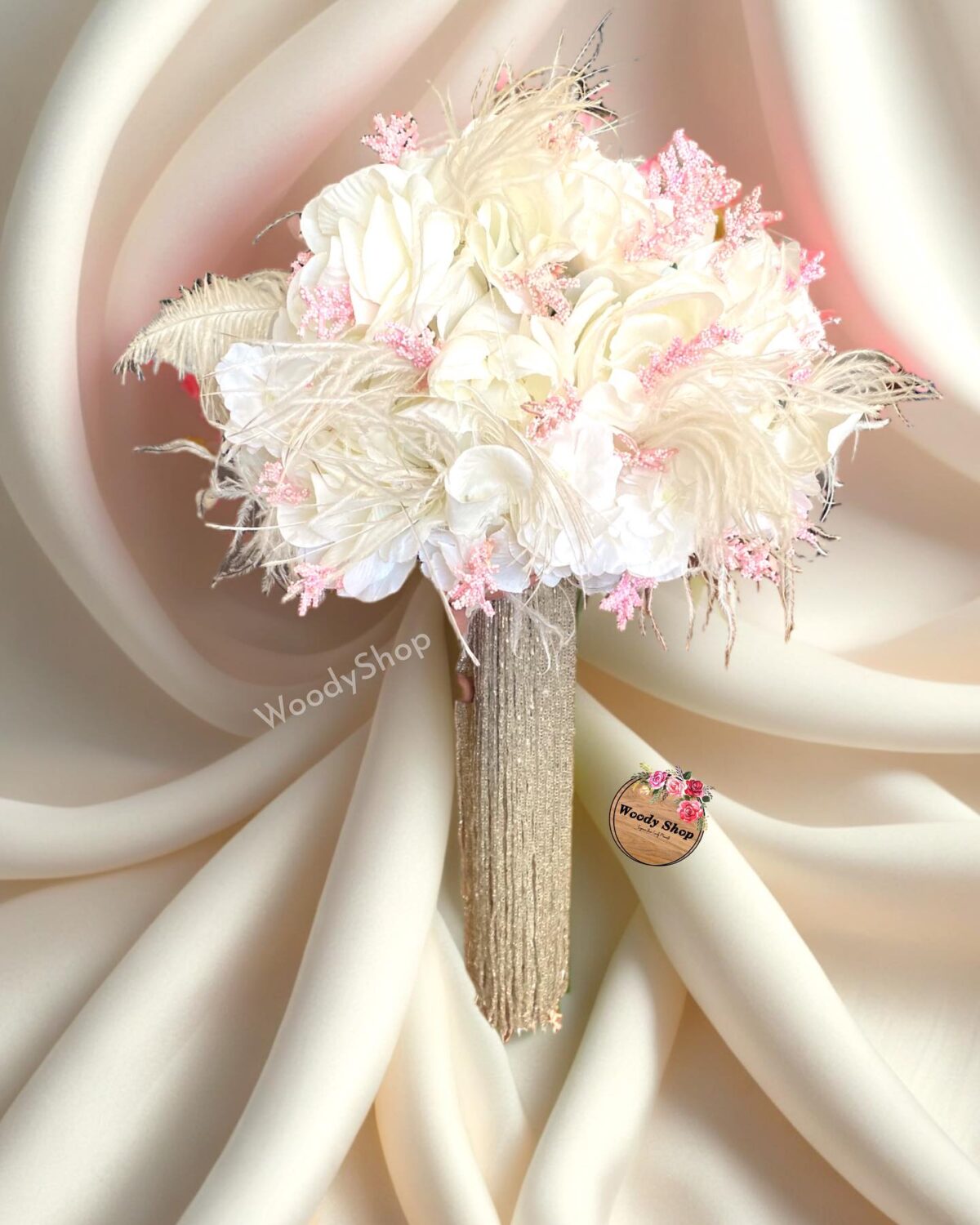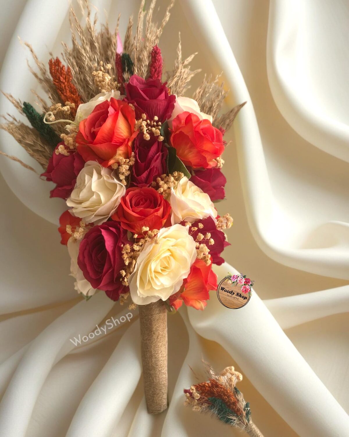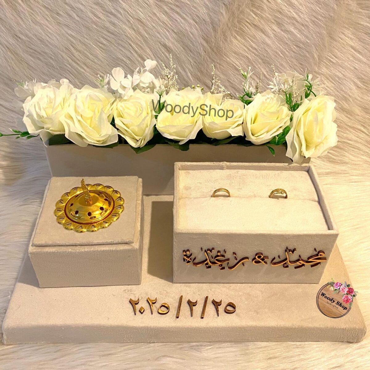• بوكيه ورد صناعي أو طبيعي مع قاعدة خشب محفورة.